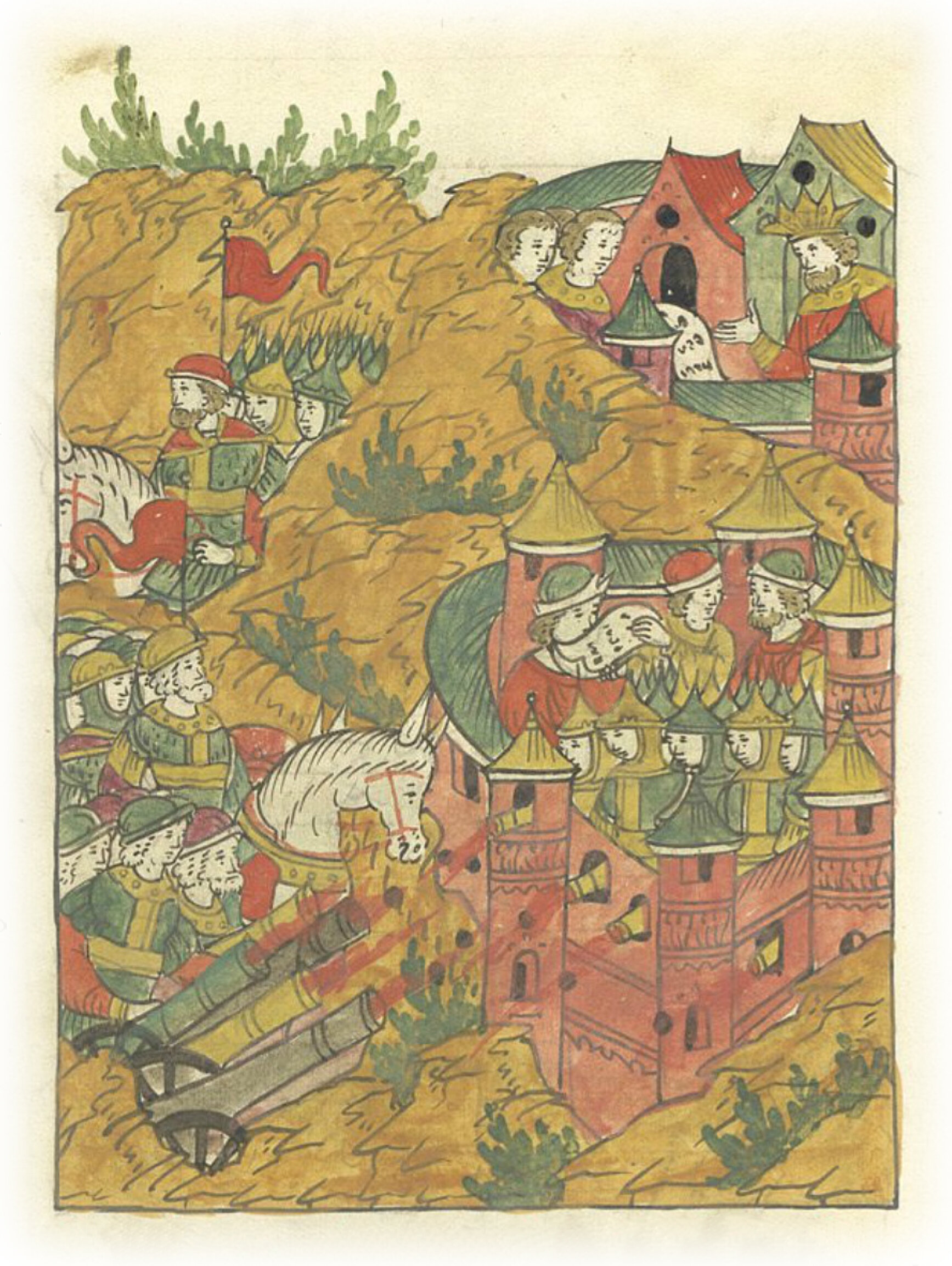 Языки говорят воеводам царя Ивана Васильевича, что магистр окопался большим рвом вокруг города Рындола, бьет из пушек и пищалей и приступает к Рындолу.