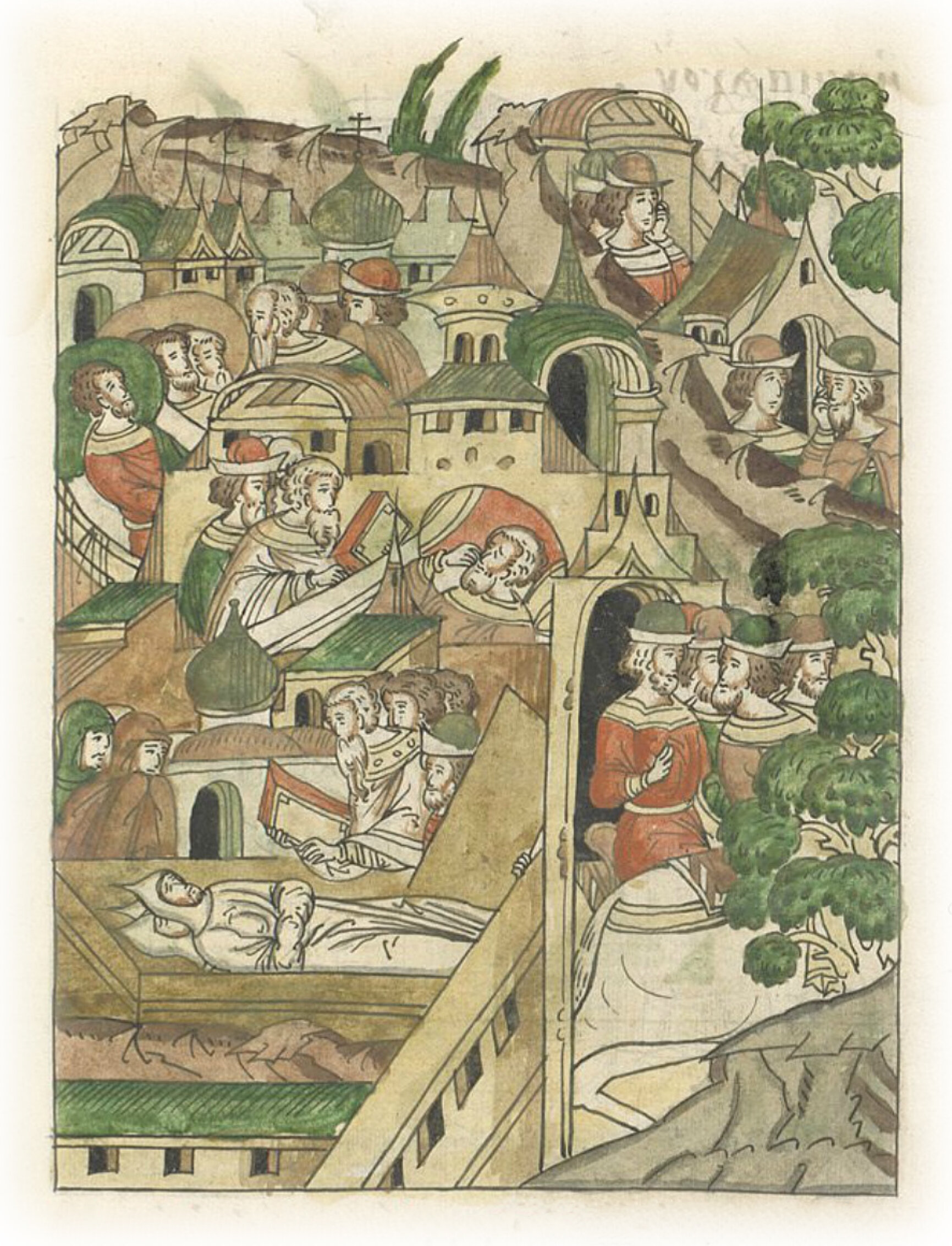 О море во Пскове. В том же году Божьим попущением был в Пскове мор великий, начался в месяце июле и (продолжался) до Рождества Христова, и воеводы городские, и сановники выехали из города из-за плача людского и из-за страха смерти; и в селах, и в местах тайных скрылись, и жили.