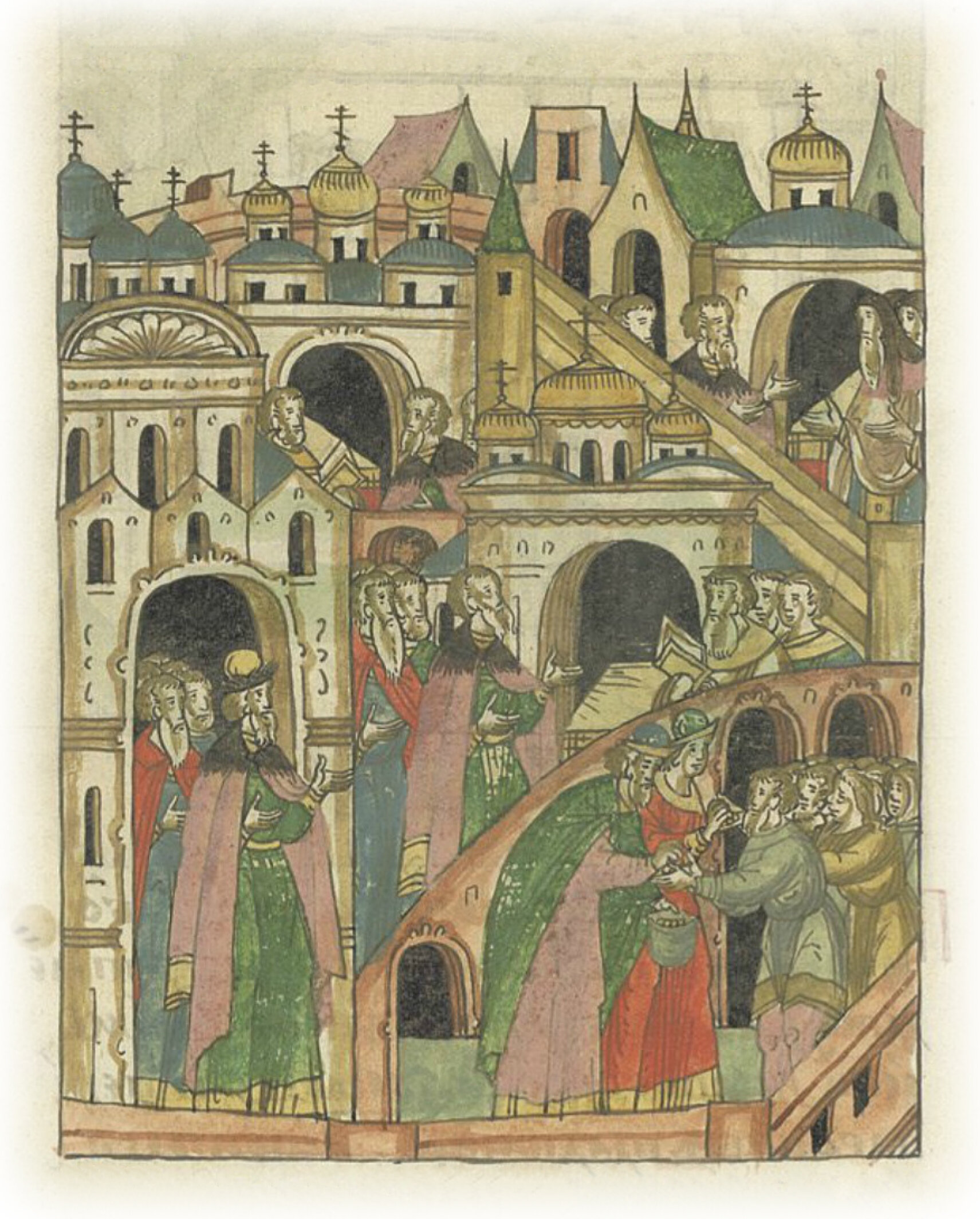 Великий князь Иван Васильевич обходит все соборные церкви и монастыри, совершая молебны и подавая милостыню.