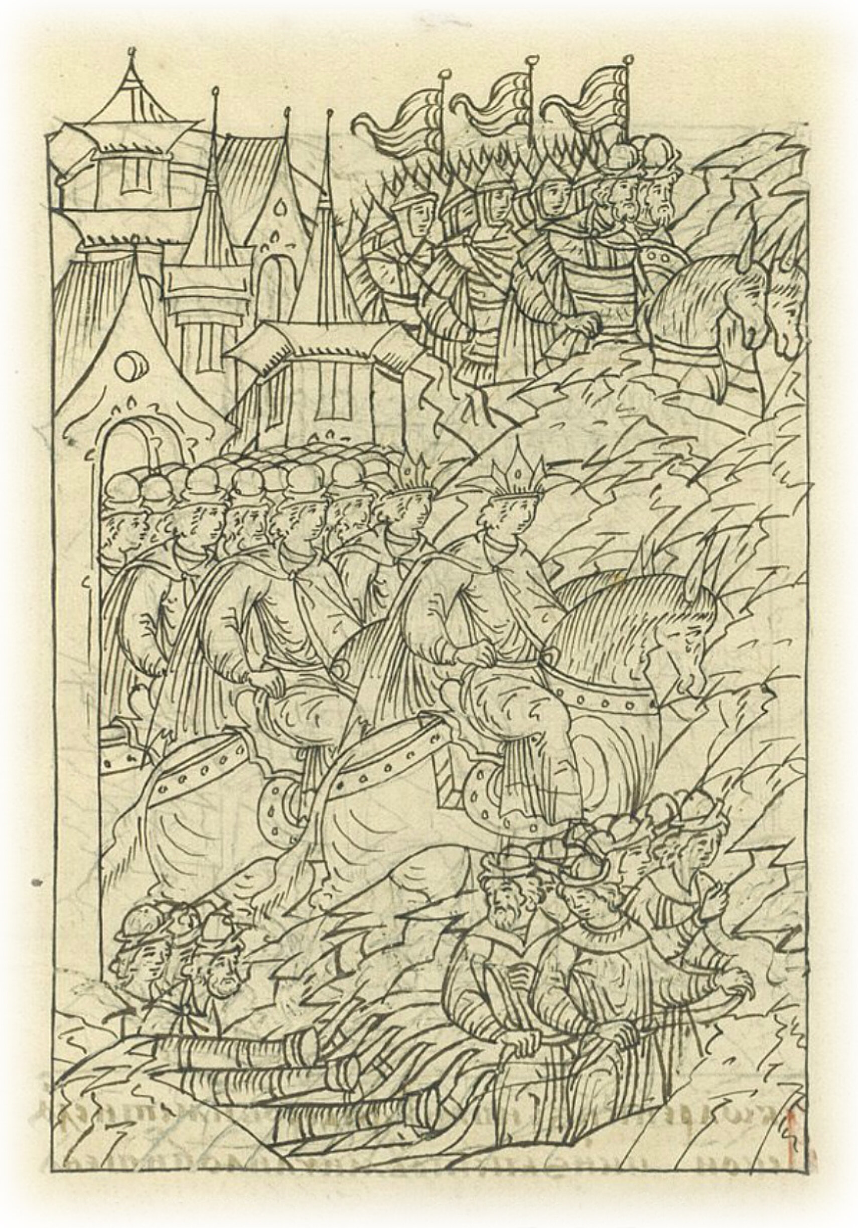 Царь Иван Васильевич идет из Нижнего Новгорода с царем Шигалеем, царевичем Едигеем, боярами и князьями к Казани.