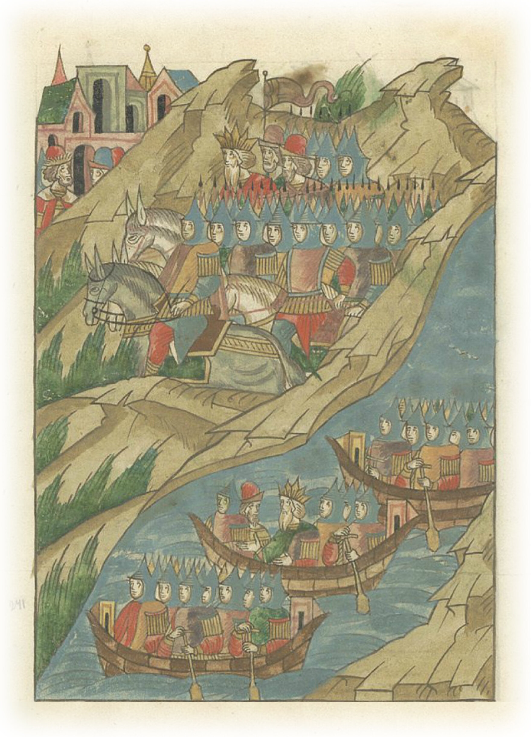 Царь Тохтамыш со своими князьями и татарами переходит Волгу и тайно идет на великого князя Дмитрия Ивановича к Москве.
