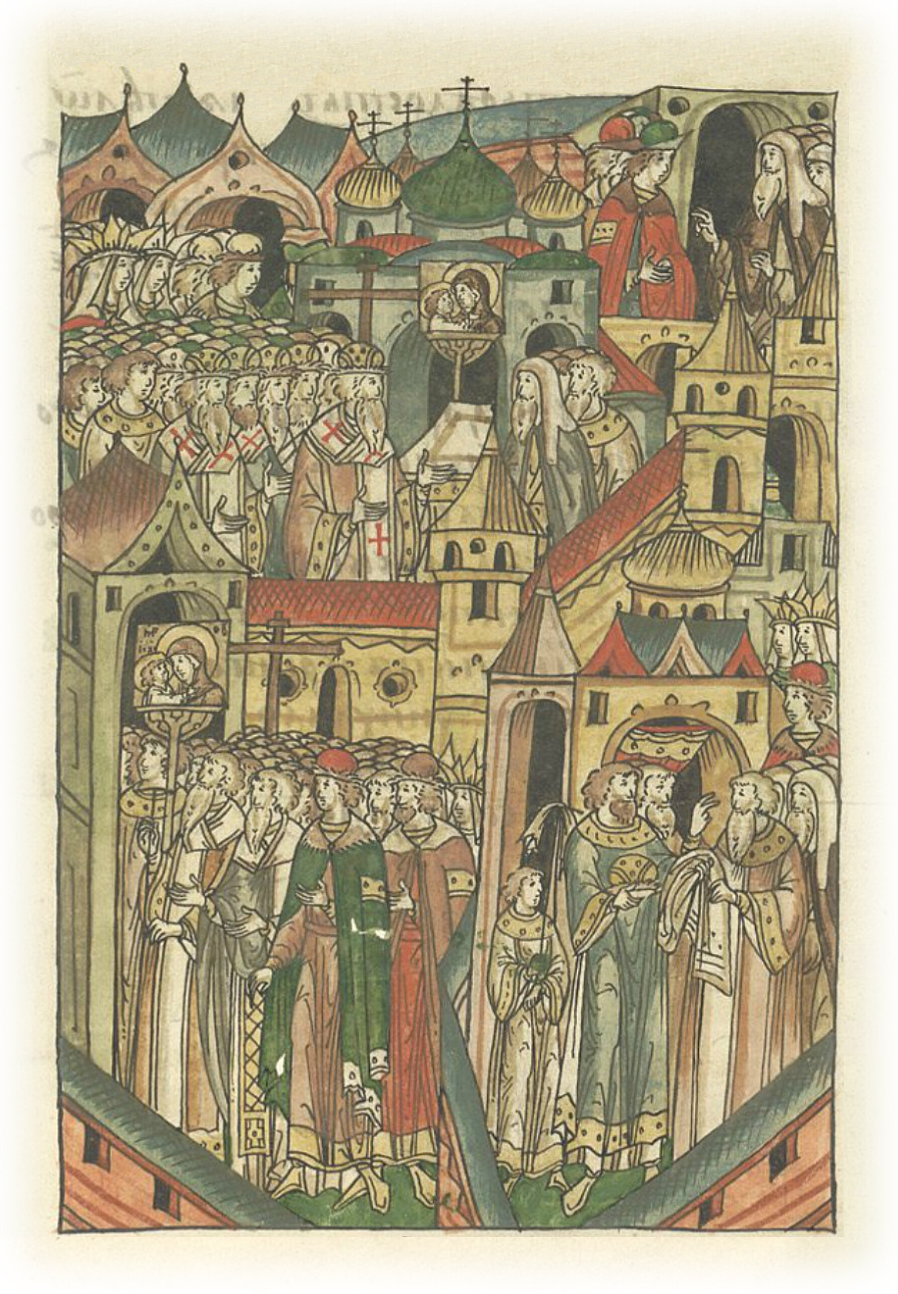 Митрополит Киприан облачился в святительские одежды у Николы Старого, и вошел в город с крестами со священным собором, и, подойдя к церкви пречистой Богородицы, занял свою митрополичью кафедру, владея своими пошлинами по старинному обычаю. И была радость великая в городе Москве. Тогда же пришли с ним в Москву и прежде названные два греческих митрополита – Матфей Адрианопольский и Никандр Гаианский, и епископ Ростовский Федор, которому патриарх Антоний Цареградский дал архиепископию и наименовал архиепископом Ростовским. С ним также были Ефросин – епископ Суздальский, Еремей грек – епископ Рязанский, Исакий – епископ Черниговский, Михаил – епископ Смоленский, Даниил – епископ Звенигородский.