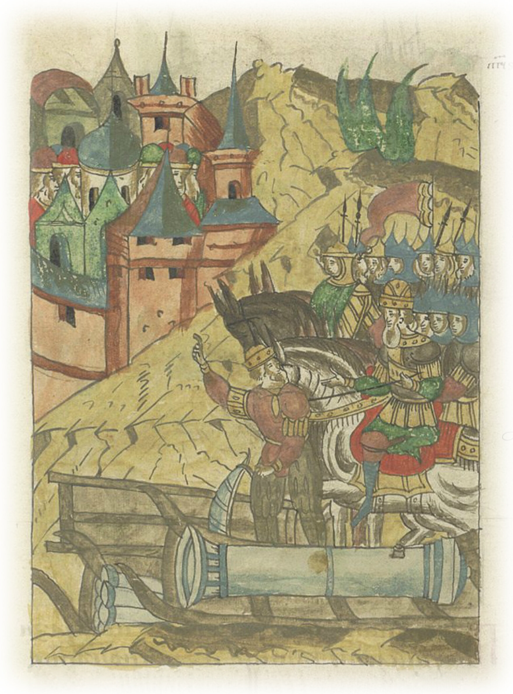 Языки говорят воеводам царя Ивана Васильевича, что магистр окопался большим рвом вокруг города Рындола, бьет из пушек и пищалей и приступает к Рындолу.