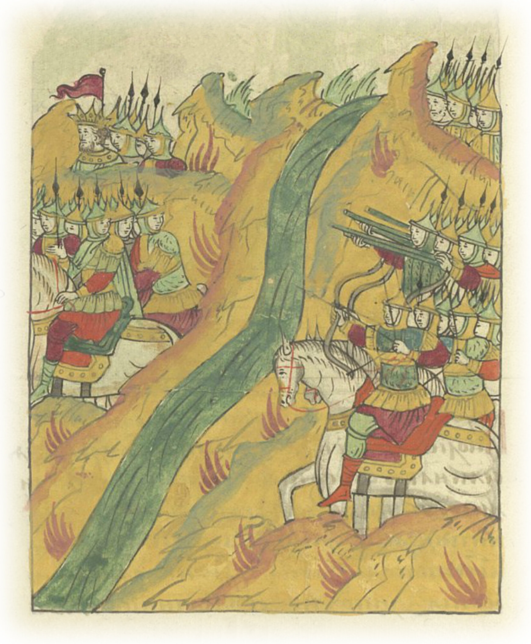 Немногие люди из всех полков великого князя приходят на помощь передовому полку и отбивают татар от берега.