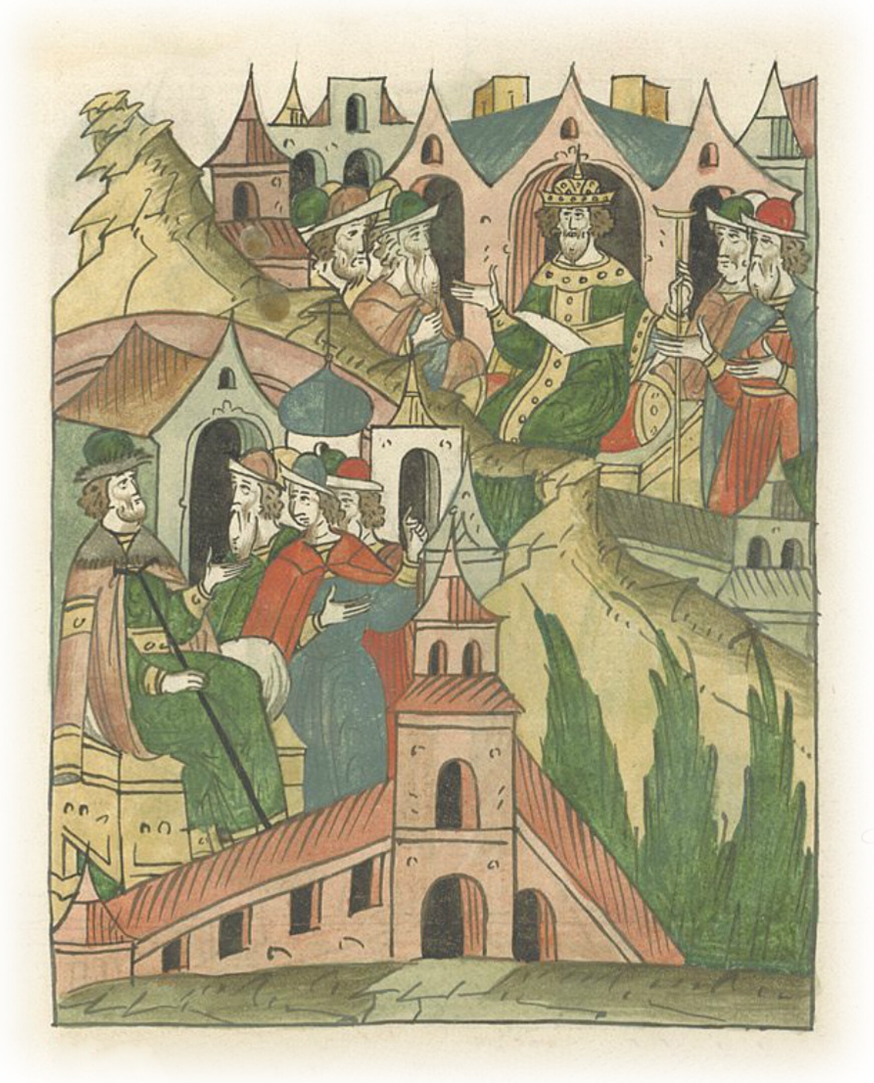 Ругодивские посадники Яким и Захар приезжают в Москву. Воеводы царя Ивана Васильевича Алексей Адашев и Иван Михайлов сообщают им, что государь пожалует их, если сдадут его воеводам помимо Ругодива Вышгород.