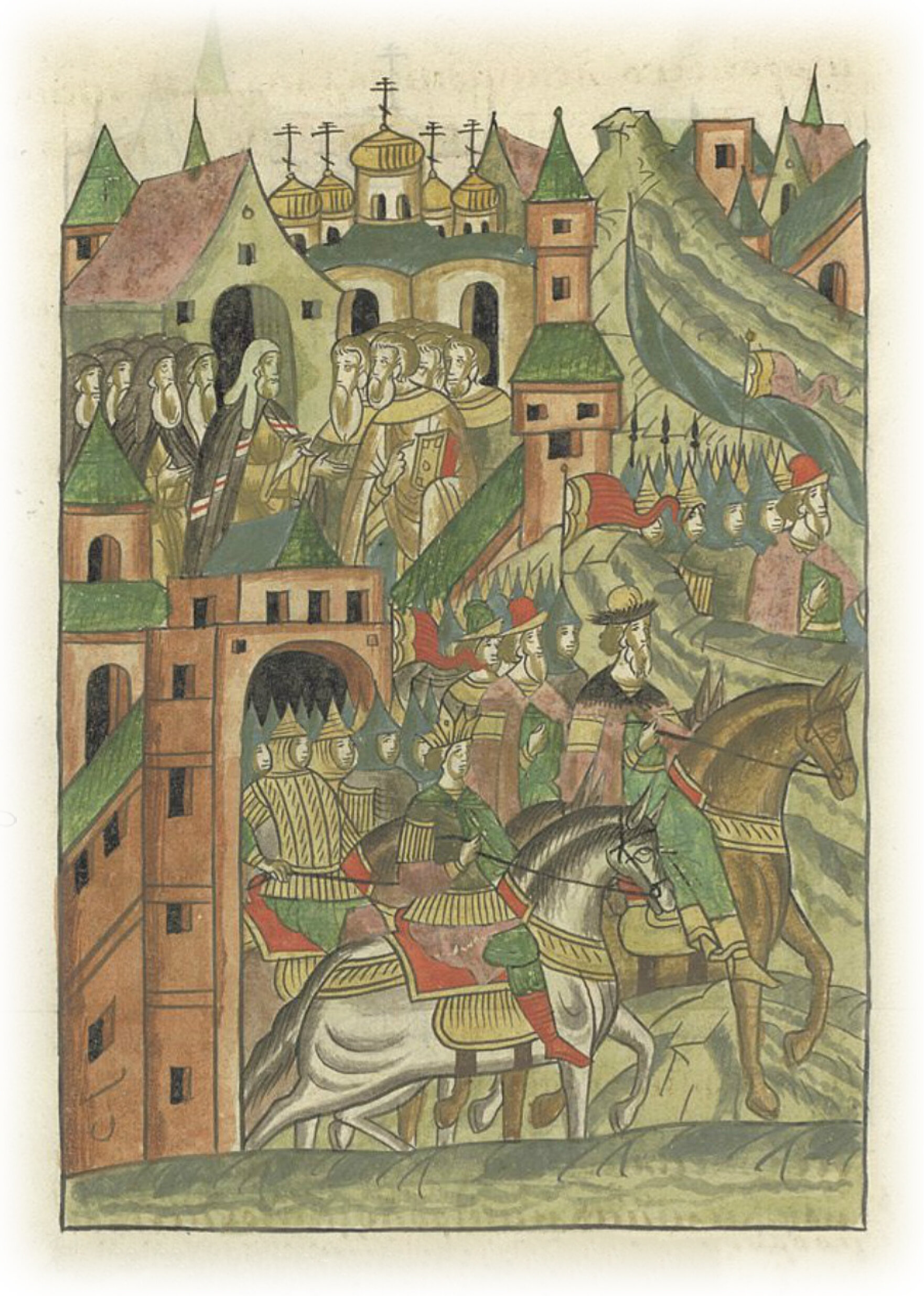 Князь же великий Иван Васильевич, приняв благословение от отца своего митрополита Филиппа и от всех епископов земли своей и от всего освященного собора, пошел из Москвы того же месяца июня в 20 день, в четверг, на память святого отца Мефодия, епископа Патарского. А с ним царевич Данияр, князья и бояре многие, и все воеводы, и прочие воины великого князя с великой силою вооружились на противника, как и прежде прадед его благоверный великий князь Дмитрий Иванович на безбожного Мамая и на богомерзкое его воинство татарское. Так и сей благоверный великий князь Иван (вооружился) на этих отступников, которые хотя и христианами назывались, а дела их были горше неверных. Ибо всегда изменяли, крестное целование преступали, но горше того начали беситься. Как прежде написано – пятьсот лет и четыре года после святого крещения были владеемы великими князьями русскими православными. Ныне же, в последнее время, за 20 лет до окончания седьмой тысячи вздумали уйти к латинскму королю и архиепископа своего поставить захотели от его митрополита Григория, латинянина. И князь великий много (раз) посылал к ним, (прося) отступиться от такового начинания, также и Филипп митрополит посылал к ним, поучая их, как детей своих, словами Божьими, сказанными в Евангелии: «Если согрешит к тебе брат твой, пойди и обличи его перед собою; и если послушает тебя, то ты приобрел брата твоего; если тебя не послушает, (возьми с собою двух) или трех свидетелей, пусть станут говорить; если и их не послушает – поведай церкви; если и от церкви начнет упорствовать – значит это иноязычник и мытарь». Эти же люди новгородские всему тому не внимали, но творили свое зломыслие. Это ли не горше неверных? Неверные ведь изначала не знали Бога, и ни от кого не научившись православию, держатся первого своего обычая, идолопоклонения. А эти, многие годы бывшие в христианстве, теперь начали отступать к латинству. И так, великий князь, уповая на Бога, ополчившись, пошел на них со всеми силами за их гордыню и непокорство, не как против христиан, но как против иноязычников и на отступников от православия.