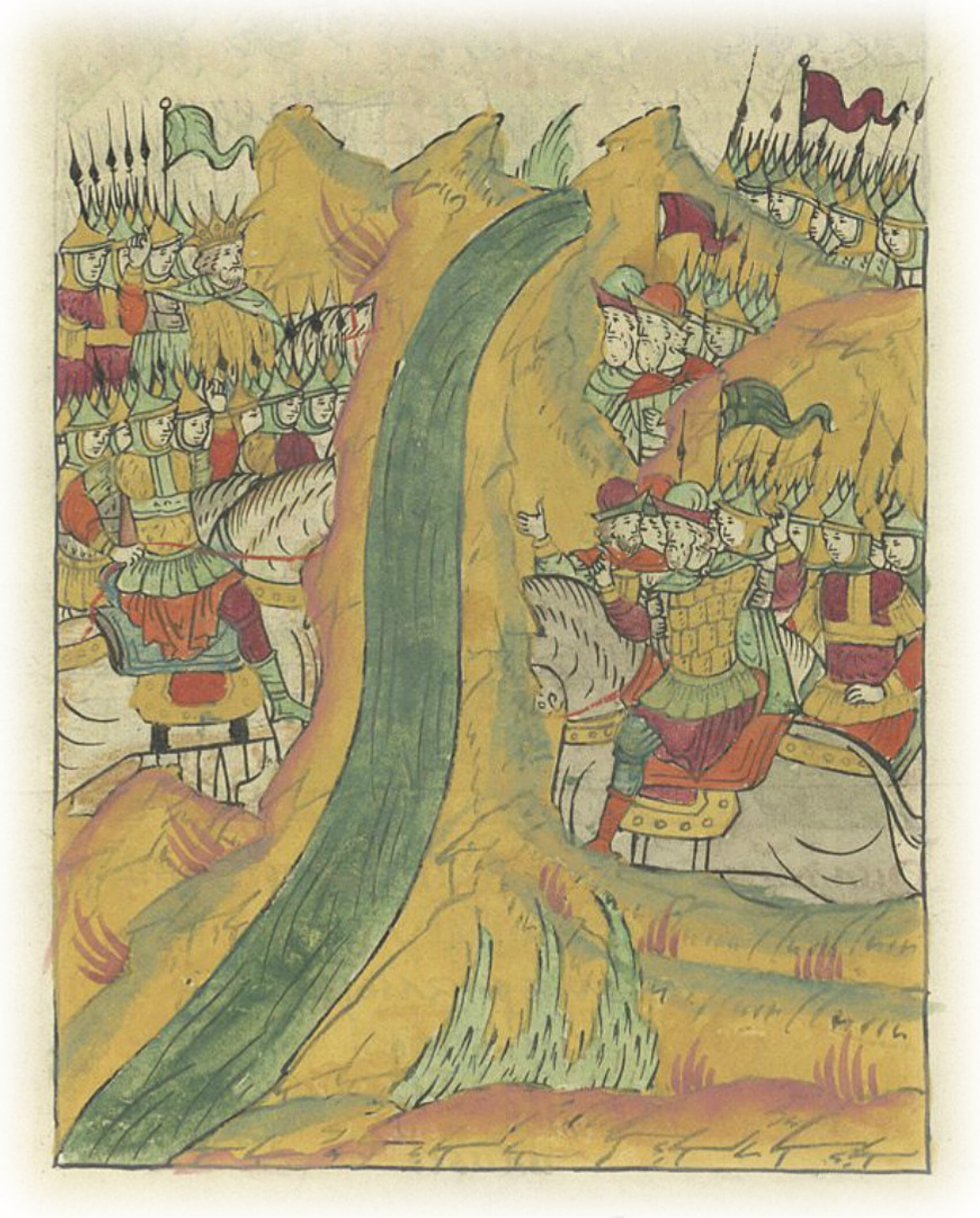 И начали браниться на татар и требовать берег. Царь же видел и дивился храбрости русских сынов; и пришел ужас на него, и пал страх в сердце его, и хотел тотчас бежать. И князья удержали его.