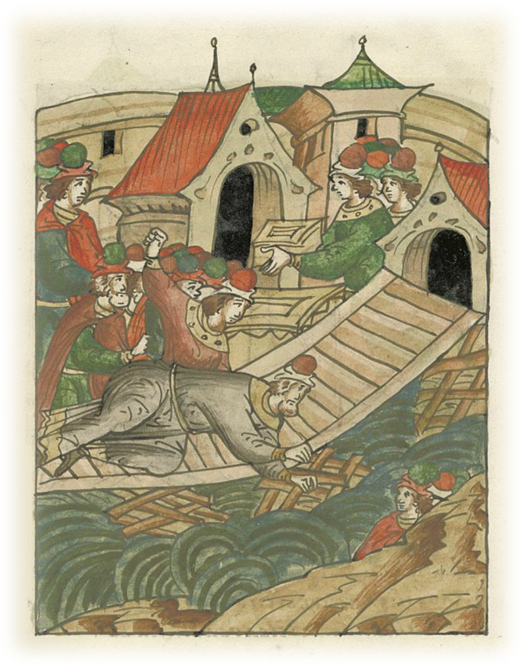 и собрал Новгород весь на Ивана Тимофеевича, и на Якима Лукьяновича, и на Прокопия Яковлевича, и осудили дома их на разграбление, а Ивана Тимофеевича убили и в Волхов бросили, и иных многих смерти предали.
