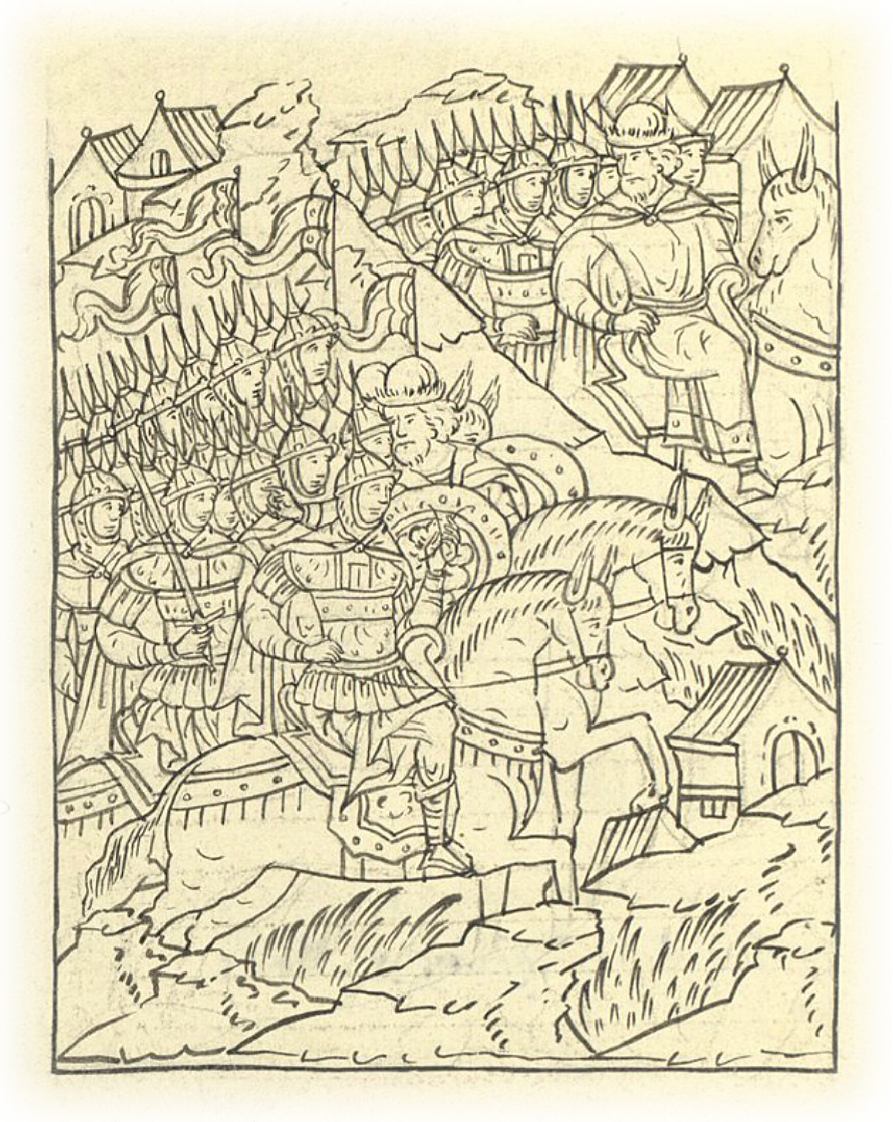 И князь Иван Овчина нагнал князя Андрея в Тюхоли, от Заяческого Яма верст с пять. И князь Андрей с князем Иваном на бой стал, людей своих вооружил и полки установил.