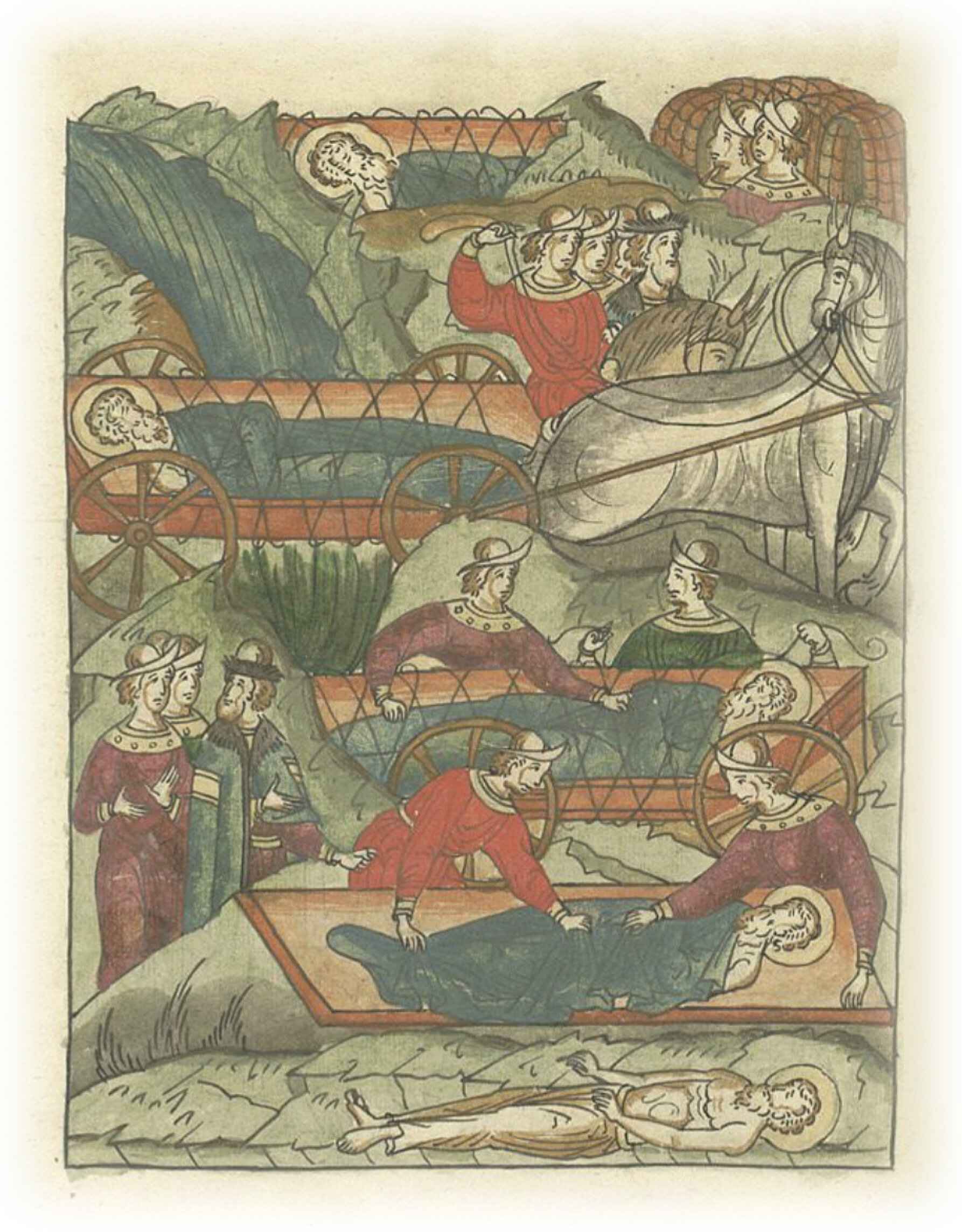Тогда князь великий Юрий Данилович Московский повелел взять тело его и положить на доску, и покрыть; также потом положили его на телегу и привязали канатами крепко, и повезли за реку, называемую Адежь, что переводится Горесть, и повелел двум (стражам) стеречь его. И когда настала ночь, обьял их страх и ужас великий, и не могли стерпеть, убежали в стан.