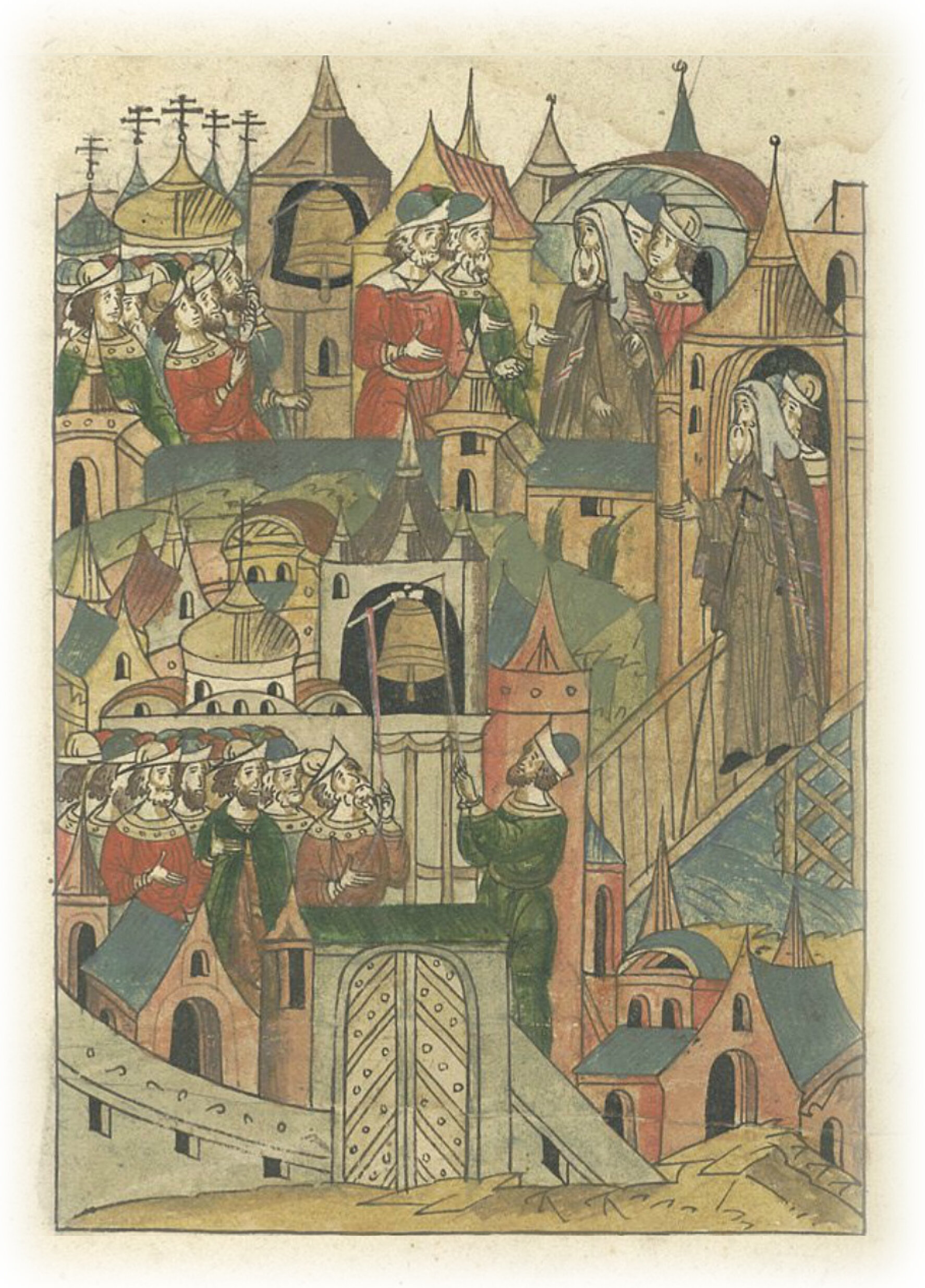 Онцыфор с Матфеем зазвонили (в колокола), созывая всех на вече у святой Софии. А Федор и Андрей стали собирать вече на Ярославовом дворе. И послали Онцыфор и Матфей владыку на вече.
