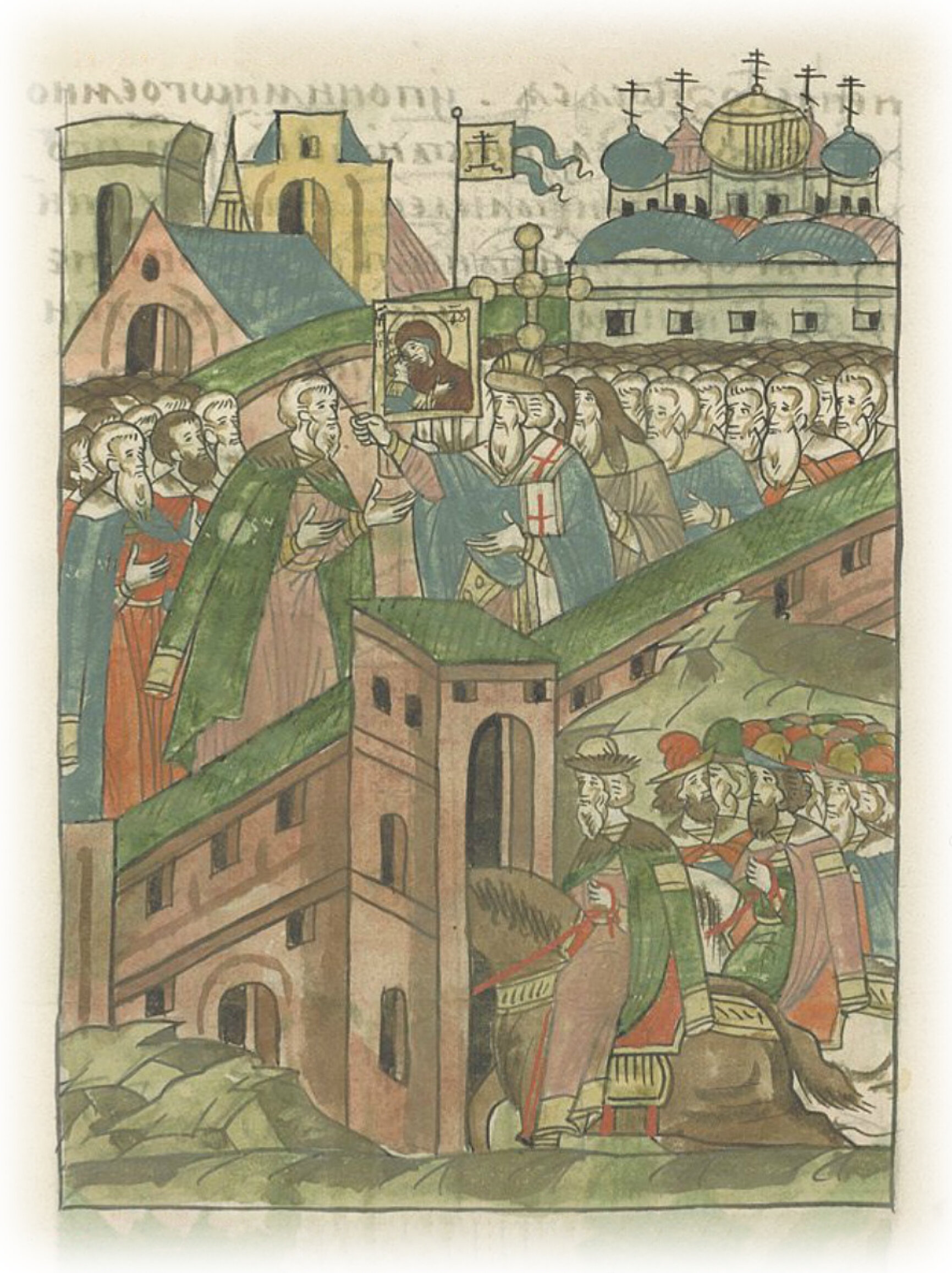 В том же месяце ноябре в 23 день в четверг въехал князь великий в Новгород. И архиепископ Феофил со всем освященным собором в священнических одеждах, и все архимандриты и игумены, иереи и дьяконы, и весь чин священнический и иноческий того города встретили великого князя с крестами, как повелел им сам князь великий, не превозносясь; и после них – многое множество из посадников и тысяцких, и бояр, и зажиточных людей, и весь государь Великий Новгород, и люди без прав и чина. Архиепископ же благословил крестом великого князя.