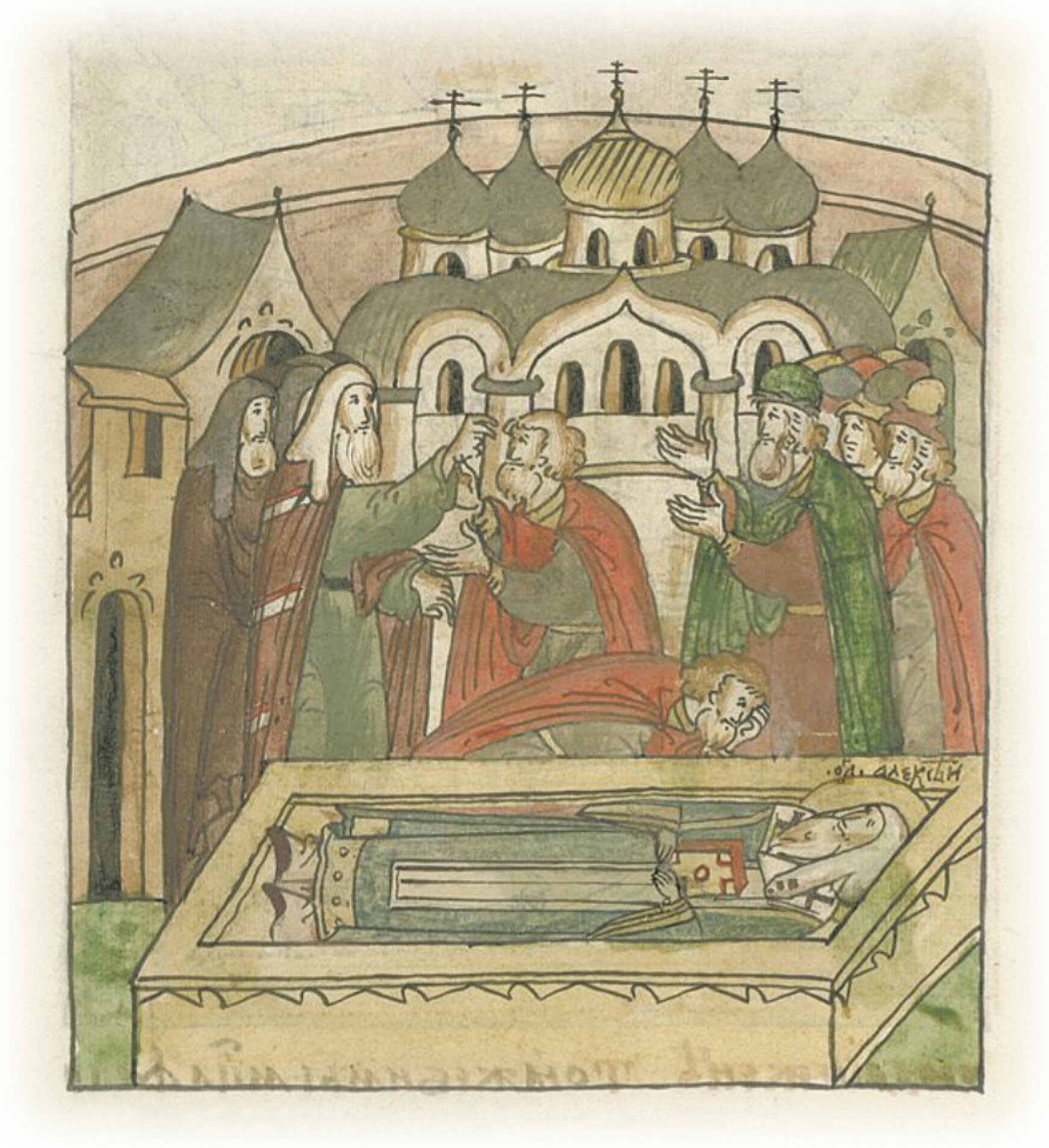 Чудо святого Алексия о слепом. И в тот же день перед обедней у гроба святого Алексея, митрополита всея Руси, чудотворца, благодаря святым его молитвам помиловал Бог, простив нищего странника слепого, именем Ивана, даровал ему все видеть, и сразу выздоровели его очи. Благоверный же великий князь Василий Иванович с отцом своим Варлаамом митрополитом, видя эти чудеса, благодарили и славили Бога и пречистую Его матерь, и святого святителя Алексия, чудотворца.