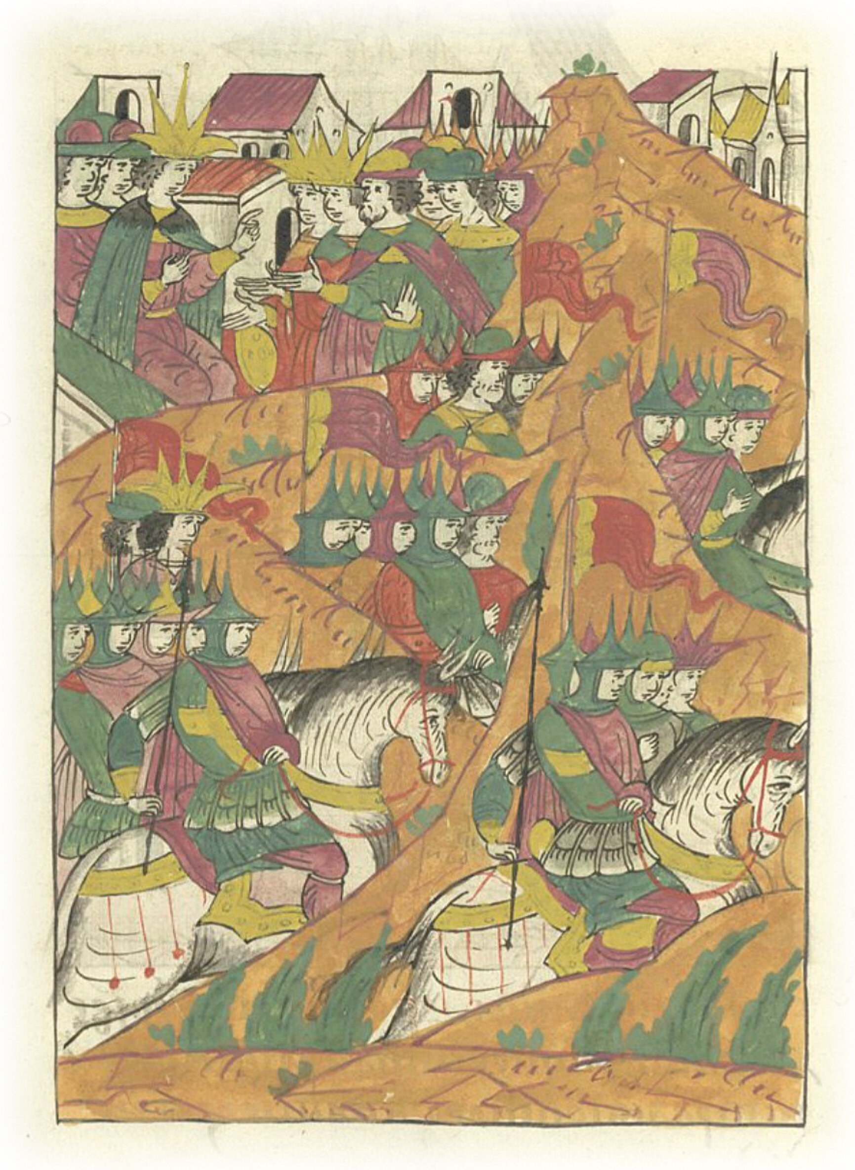 Об устроении полков, (посланных) в немецкую землю. И отпустил государь: в большом полку – царь Шигалей, боярин и воевода Михаил Васильевич Глинский и Даниил Романович, и черкасские князья, Сибок с братьями: а в передовом полку – царевич Тахтамыш, боярин и воевода Иван Васильевич Шереметев Большой и Алексей Даниилович Басманов, и черкасские князья, князь Иван Маашик с братьями; а в передовом же полку – Даниил Адашев, а с ним казанские люди из Казани, Свияги и Чебоксар, и черемисы, и новокрещены; а в полку правой руки – царевич Кайбула, воевода князь Василий Семенович Серебряный и окольничий Иван Васильевич Шереметев Меньший; а в (полку) правой же руки – князь Юрий Репнин, а с ним городецкие люди, сеит* и князья, и мурзы; а в (полку) левой руки воеводами – боярин князь Петр Семенович Серебряный и Михаил Петров, сын Головин; а в сторожевом полку воеводами – князь Андрей Михайлович Курбский и Петр, сын Петров; и все новгородские и псковские люди со всеми воеводами и из московских городов многие. И из Москвы были отпущены царь и воеводы, и велел государь в Новгороде собираться людям. * в Казанском ханстве – глава духовенства.