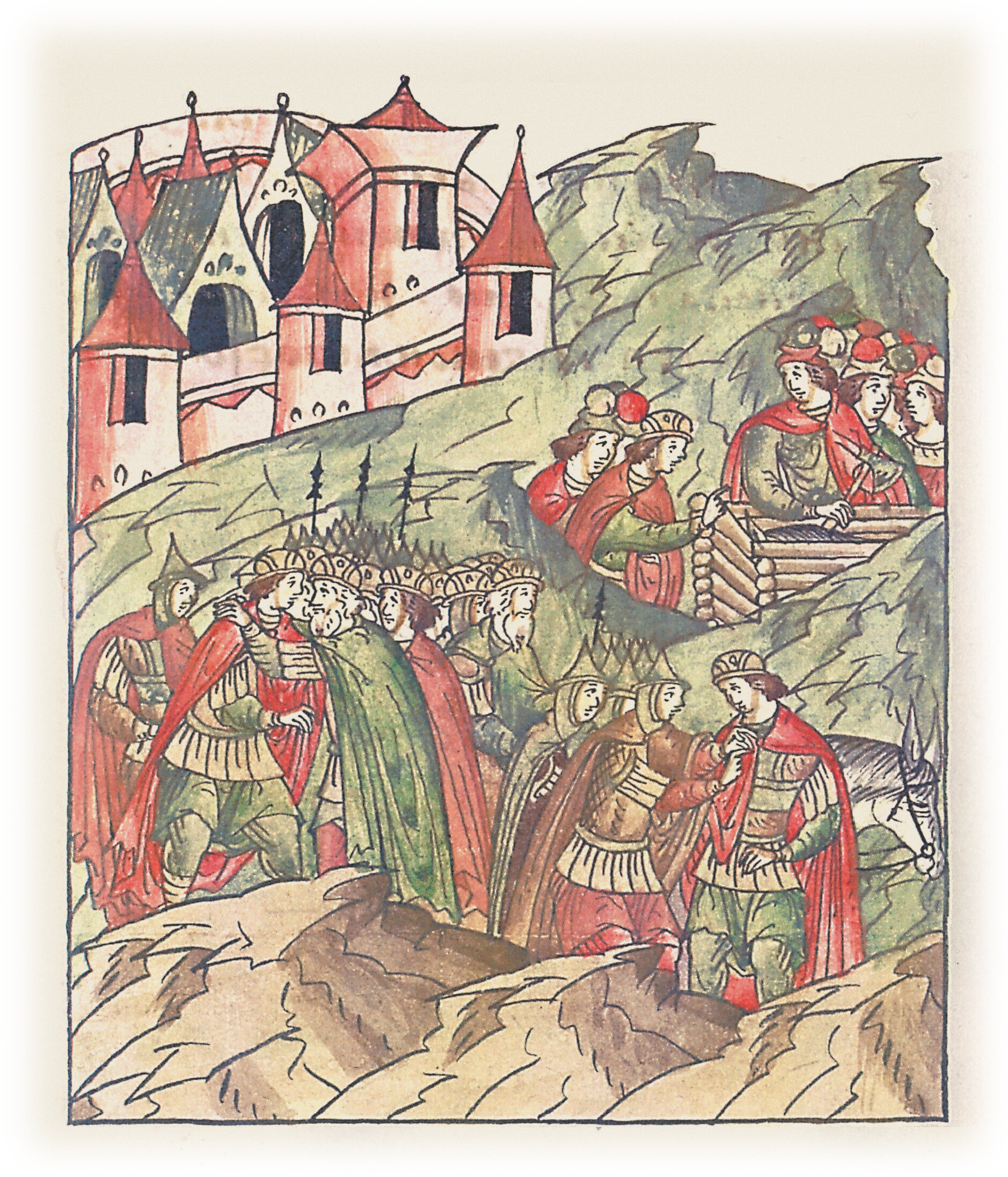 Отец, великий князь Юрий Владимирович, дядя и братья князя Андрея Юрьевича утешают его и залечивают раны, а также хоронят его коня.