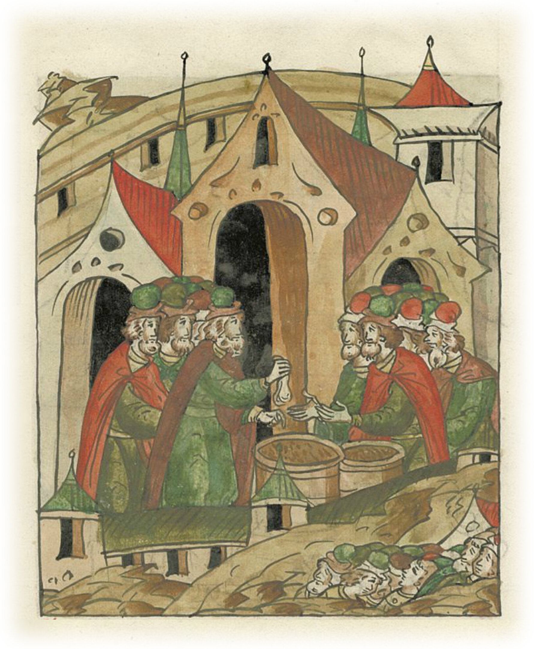 И покупали хлеб по восьми кун, а четверть ржи – по 20 гривен новгородских, а в иных местах пустых сельских четверть ржи – по 30 гривен, а пшеница – по 40 гривен новгородских, а пшено – по 50 гривен новгородских, а овса четверть – по 12 гривен; и был великий мор в народе от голода, так что не было сил хоронить их.