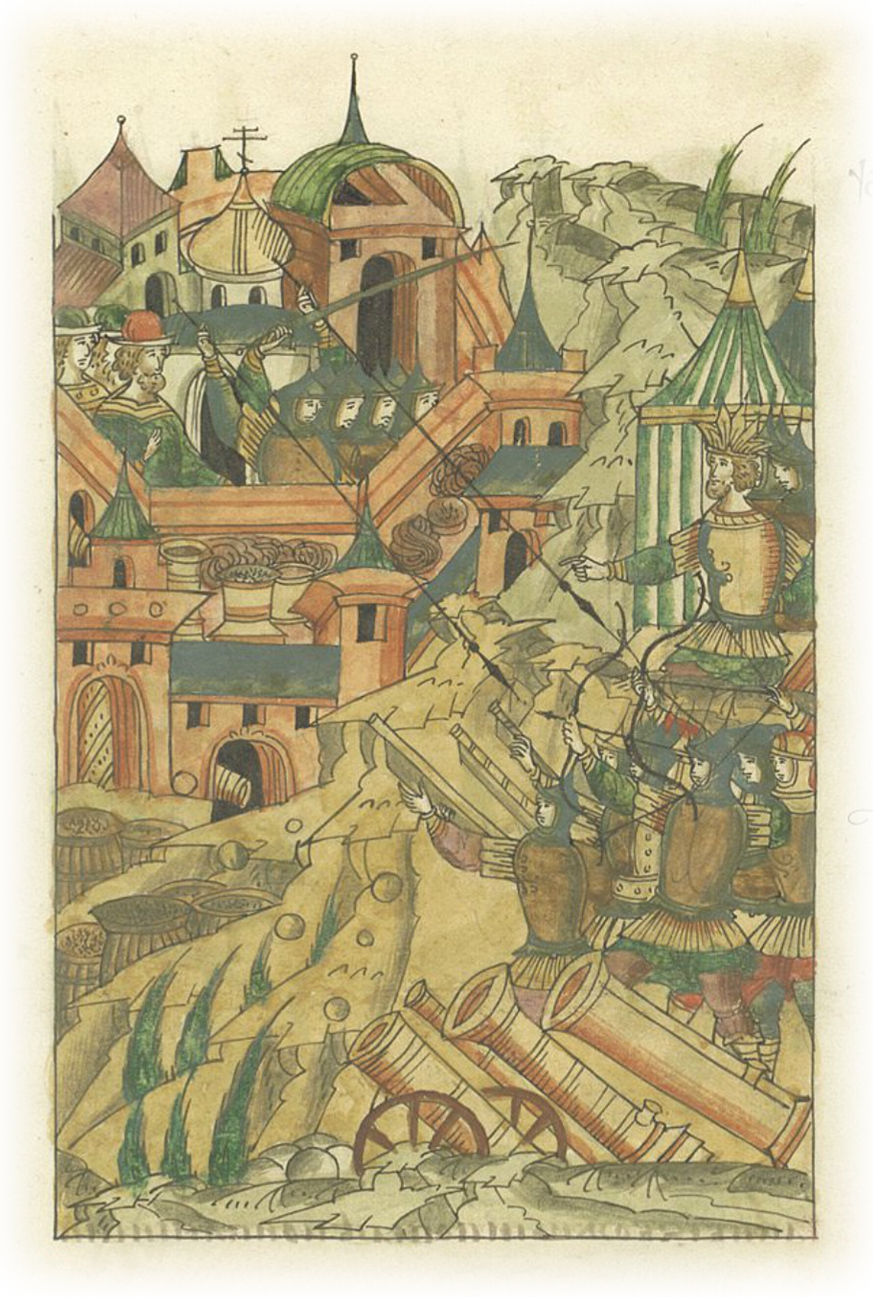 Также и на стенах готовили многие сосуды, наполненные смолой и горючей серой, и тканью со смолою и зельем пушечным. Минул уже 25 день, как бились каждый день.