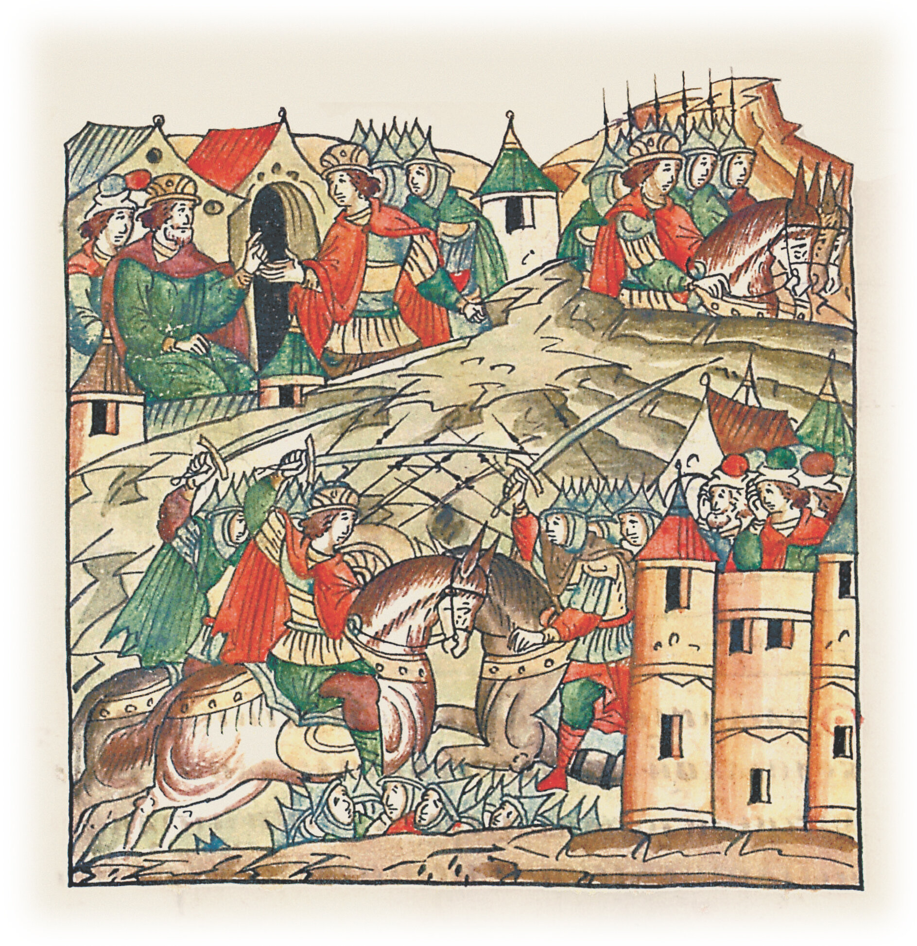 Языки говорят воеводам царя Ивана Васильевича, что магистр окопался большим рвом вокруг города Рындола, бьет из пушек и пищалей и приступает к Рындолу.