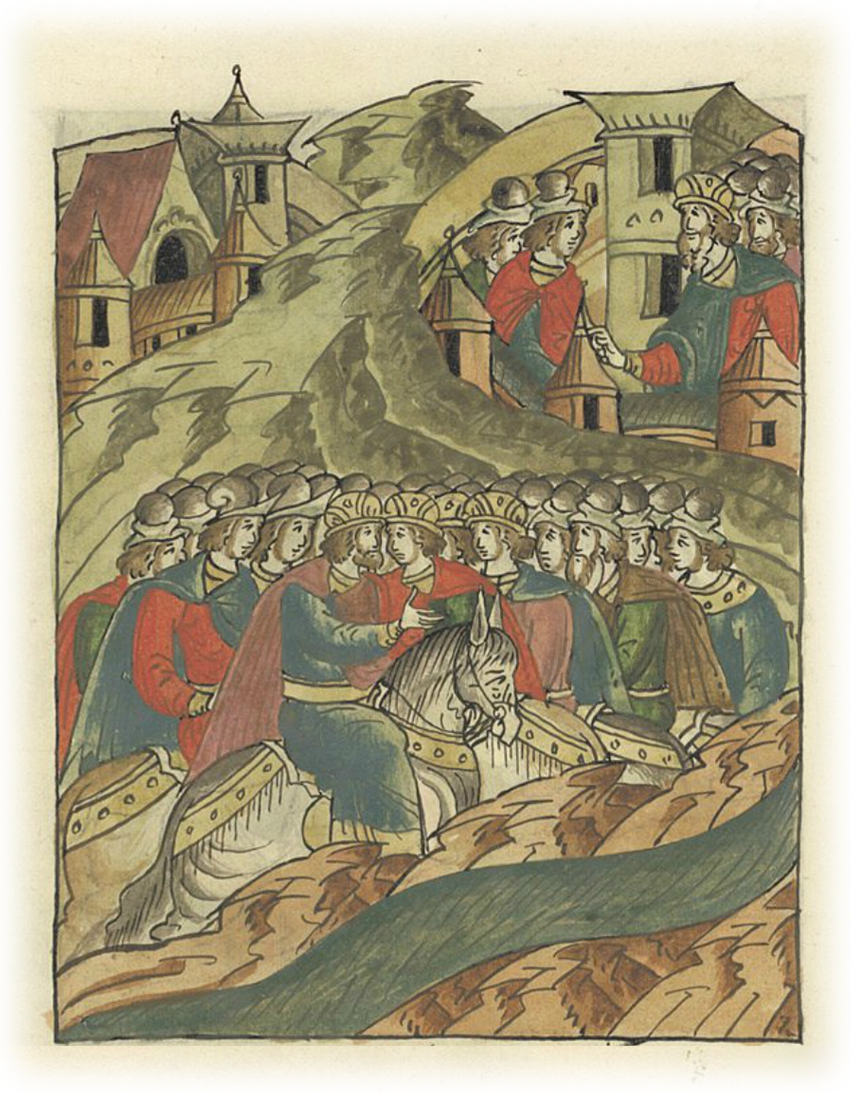 В тот же день пришел Константин к отцу из Новгорода, встретили его братья на реке Шедакше: Юрий, Ярослав и Владимир с Иоанном, и все мужи его отца, и весь город, и целовали его любезно.