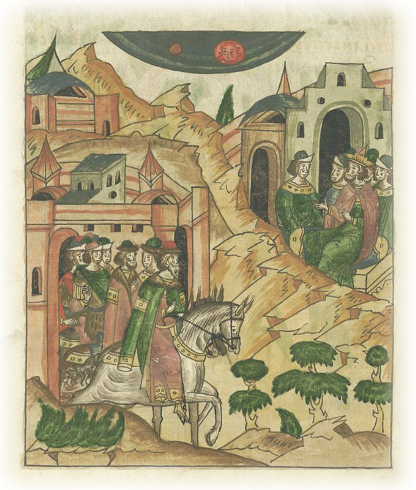 Князья Ярослав Ярославич, его брат Василий Ярославич Костромской и их племянник Дмитрий Александрович Переяславский идут в Орду к царю. Знамение на солнце.