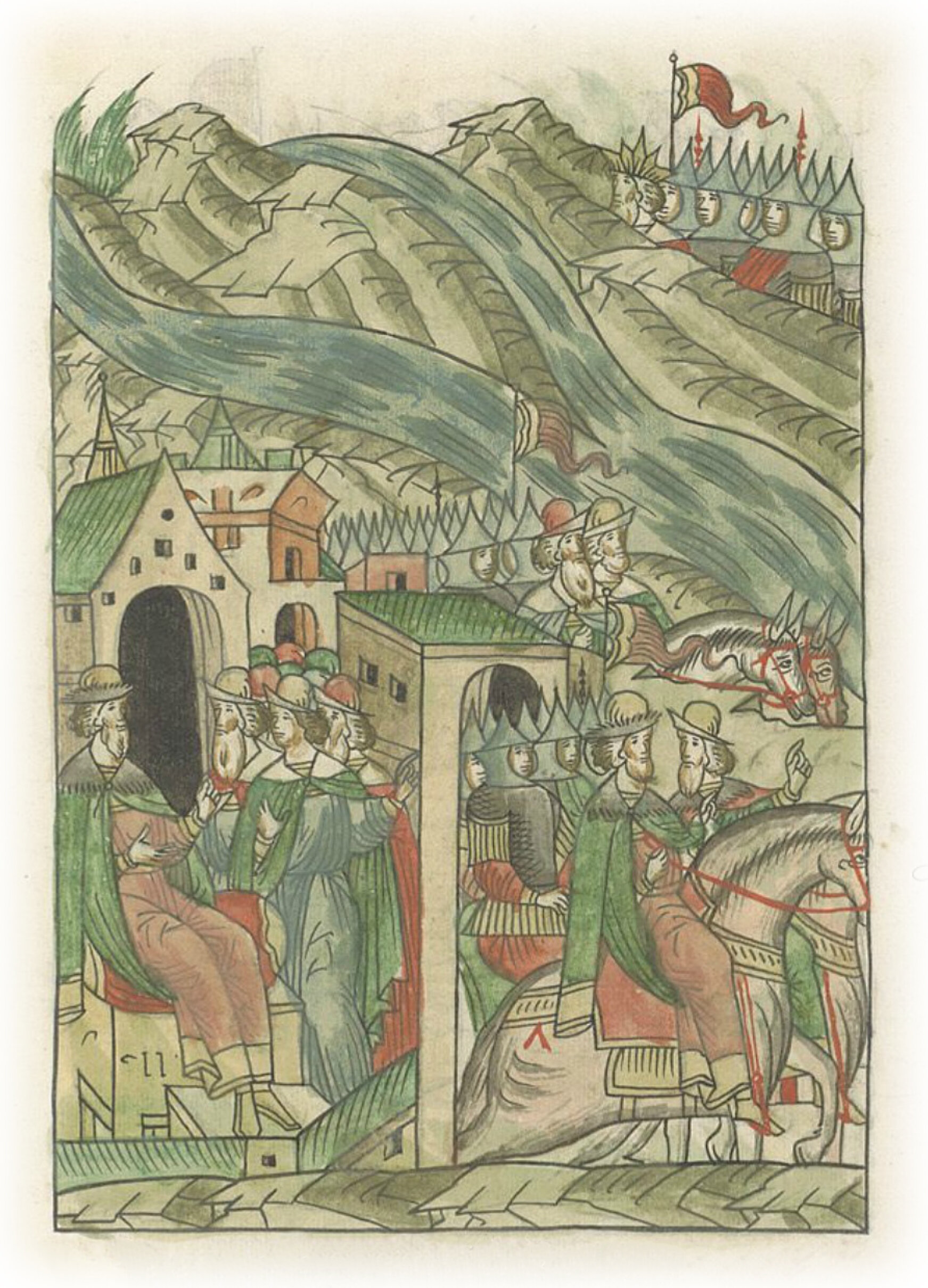Языки говорят воеводам царя Ивана Васильевича, что магистр окопался большим рвом вокруг города Рындола, бьет из пушек и пищалей и приступает к Рындолу.