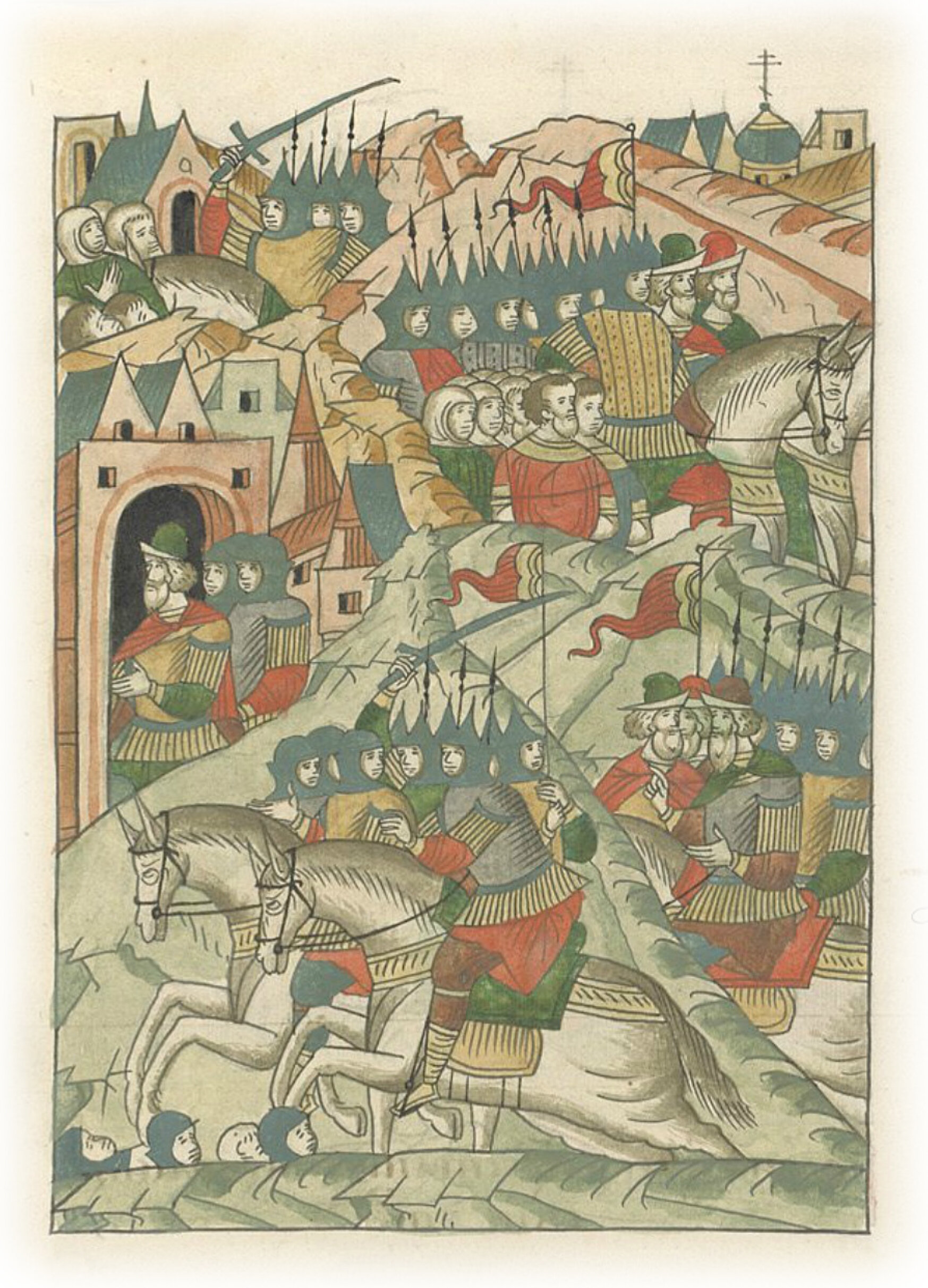 Языки говорят воеводам царя Ивана Васильевича, что магистр окопался большим рвом вокруг города Рындола, бьет из пушек и пищалей и приступает к Рындолу.