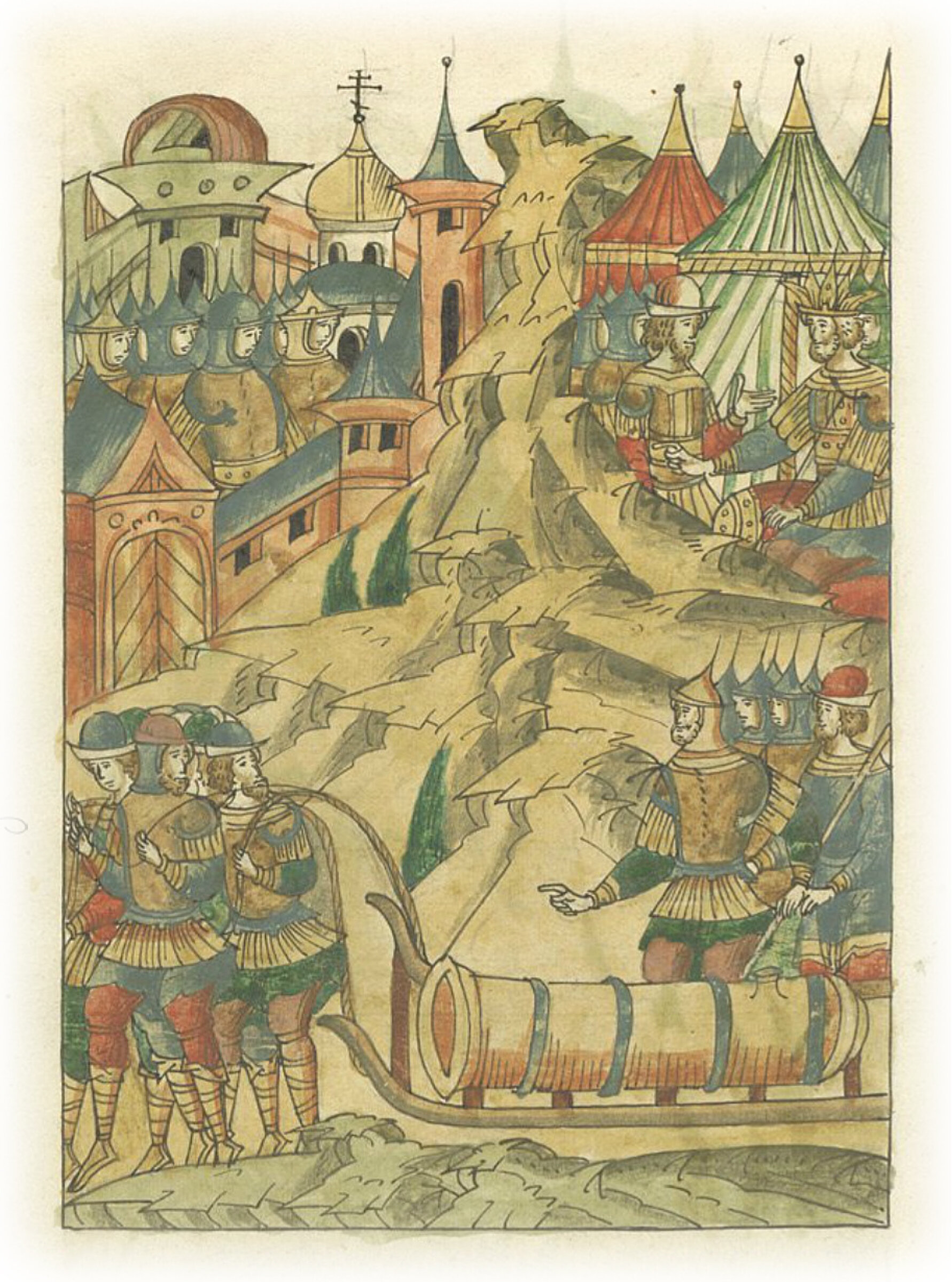 Безбожный повелел прикатить пушку великую, которая была увязана обручами железными, надеясь укрепить ее.