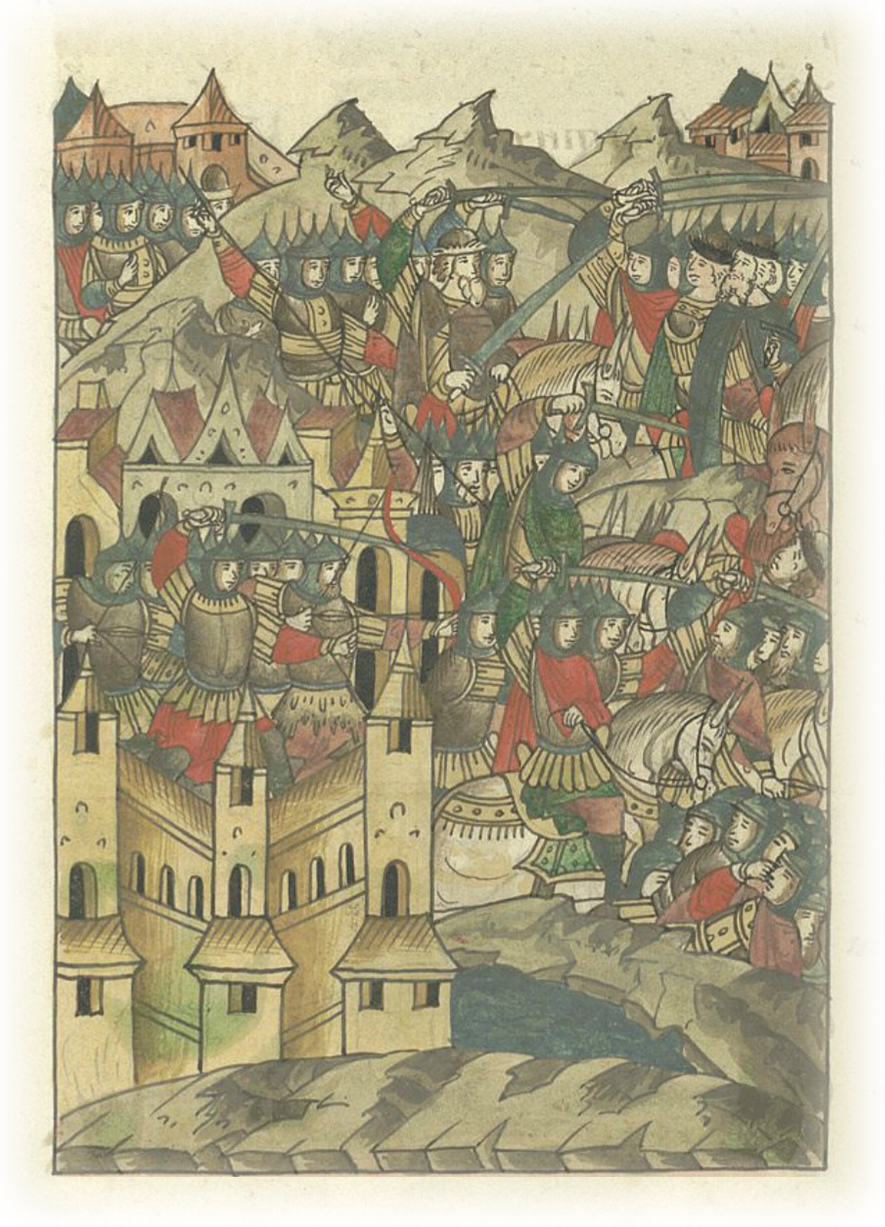 Языки говорят воеводам царя Ивана Васильевича, что магистр окопался большим рвом вокруг города Рындола, бьет из пушек и пищалей и приступает к Рындолу.