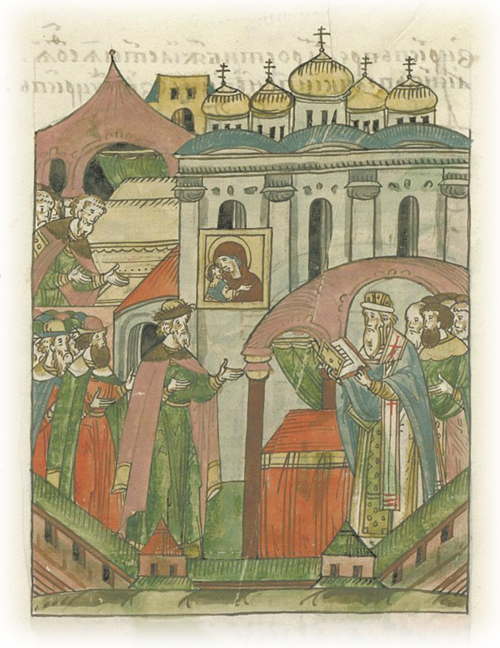 Также и у гробов прародителей своих, великих князей прежних, лежащих там. Архиепископ же совершил литургию тогда со всем освященным собором; а князь великий стоял на службе той, умильно и благочинно молясь и прося отпущения грехов своих у Господа Бога и Пречистой Его Матери, призывая на помощь и святых, угодивших Господу своему Исусу Христу.