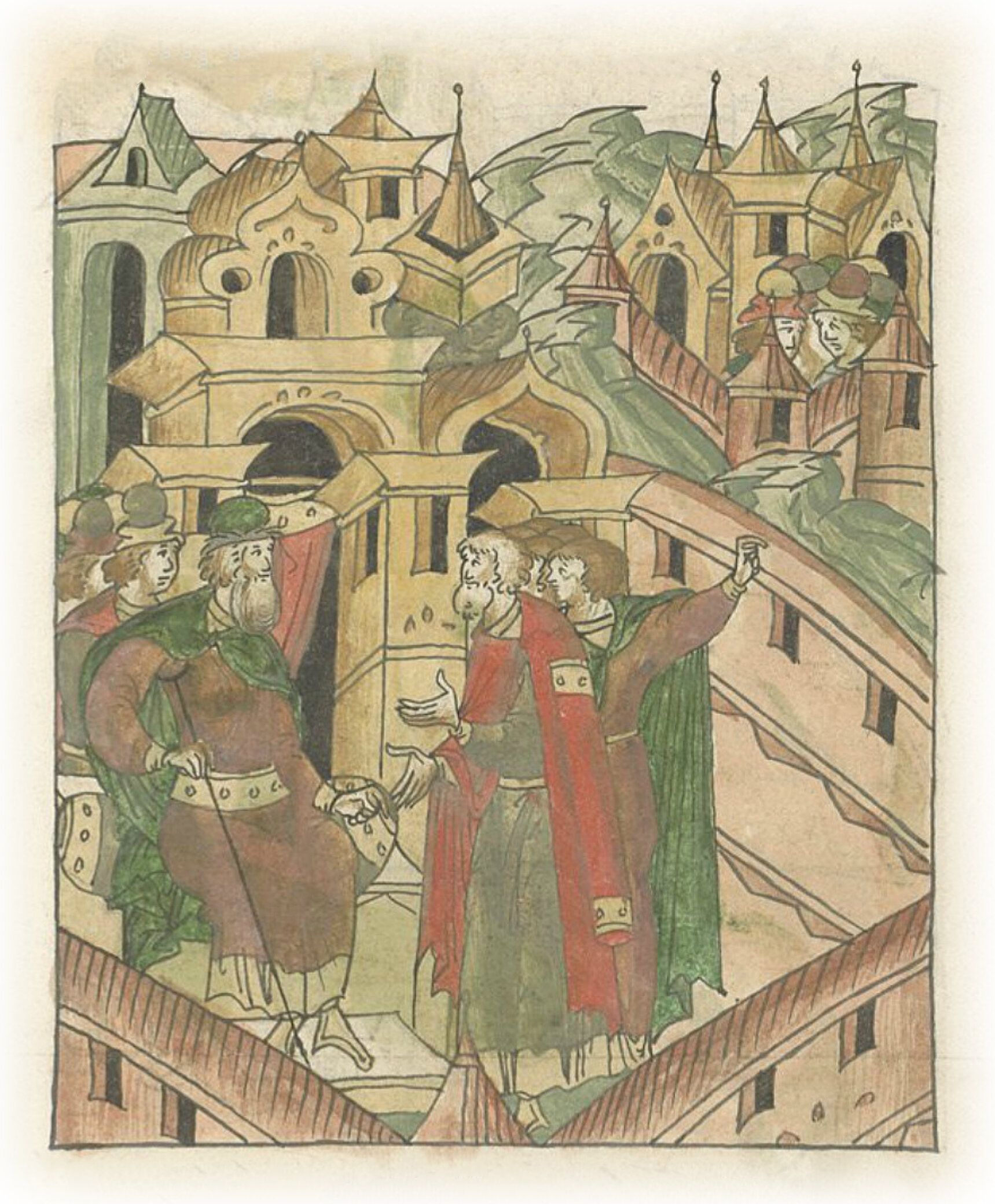 Ругодивские посадники Яким и Захар приезжают в Москву. Воеводы царя Ивана Васильевича Алексей Адашев и Иван Михайлов сообщают им, что государь пожалует их, если сдадут его воеводам помимо Ругодива Вышгород.
