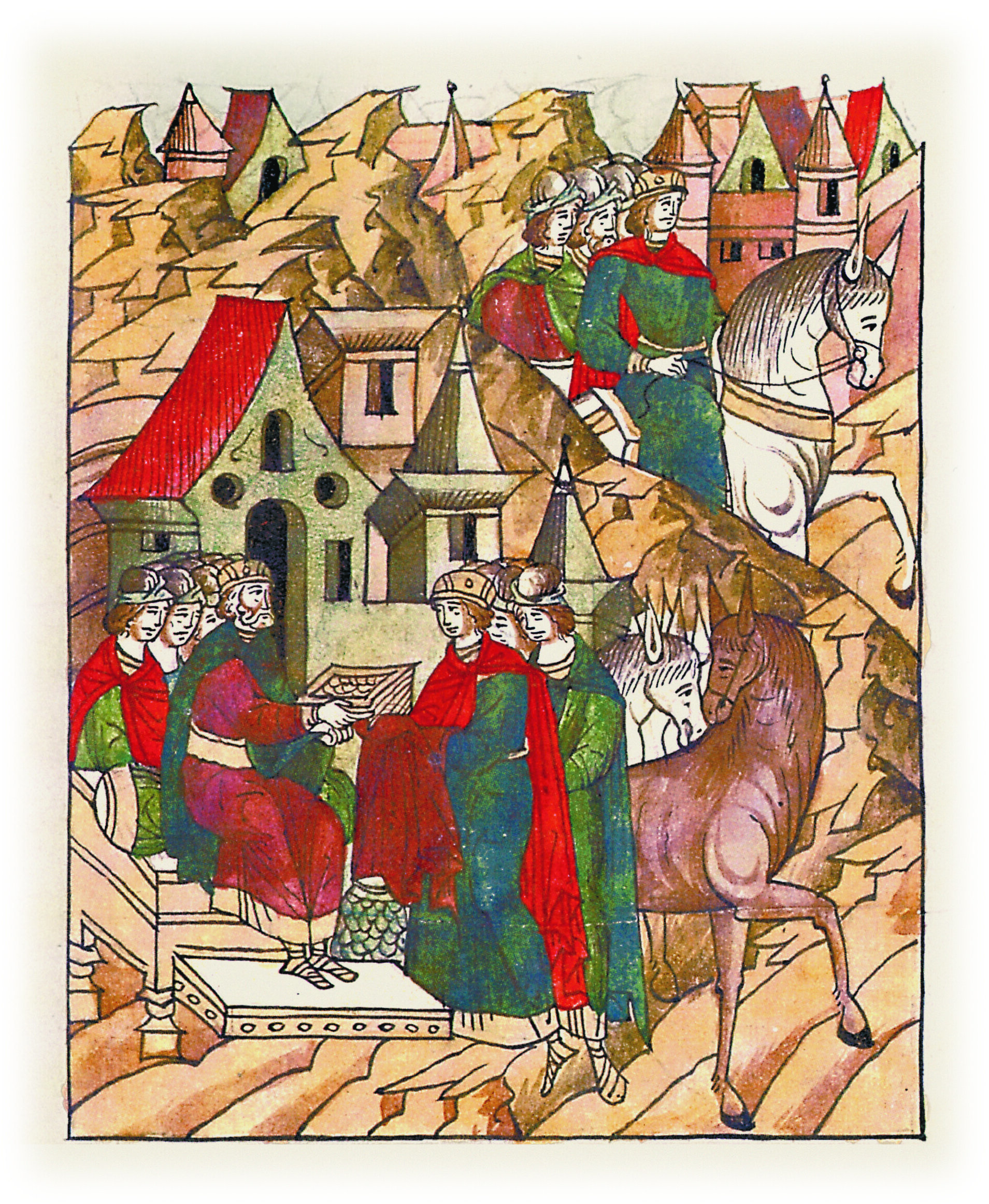 Киевский князь Ярополк одаривает своего племянника Изяслава Мстиславича.
