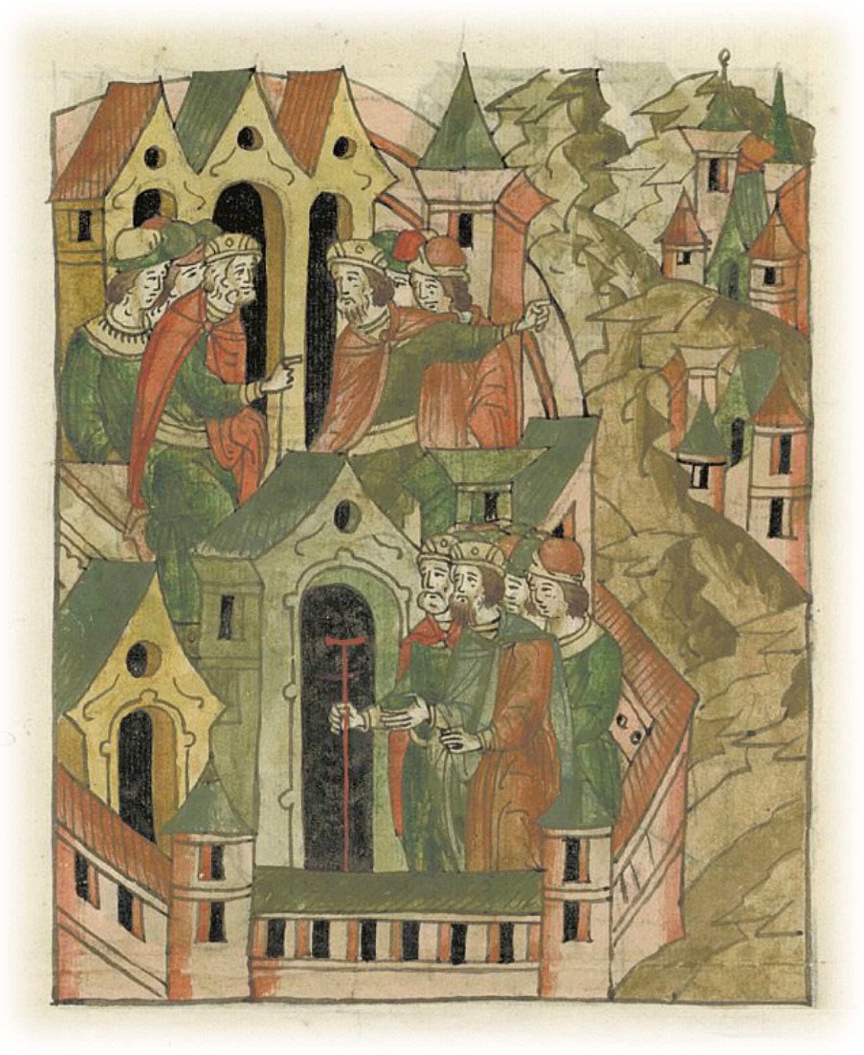 Ругодивские посадники Яким и Захар приезжают в Москву. Воеводы царя Ивана Васильевича Алексей Адашев и Иван Михайлов сообщают им, что государь пожалует их, если сдадут его воеводам помимо Ругодива Вышгород.