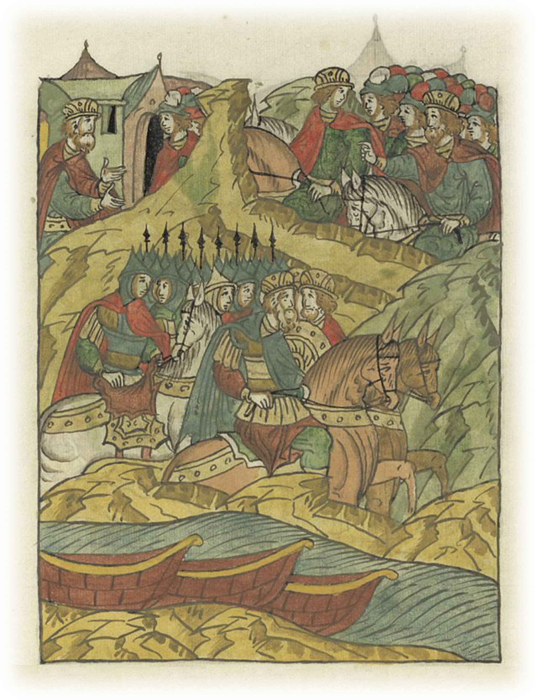 И тотчас послали к нему князя Всеволода, шурина его, а сами пошли по Волге вниз, бросив (возы) и пересев на коней.