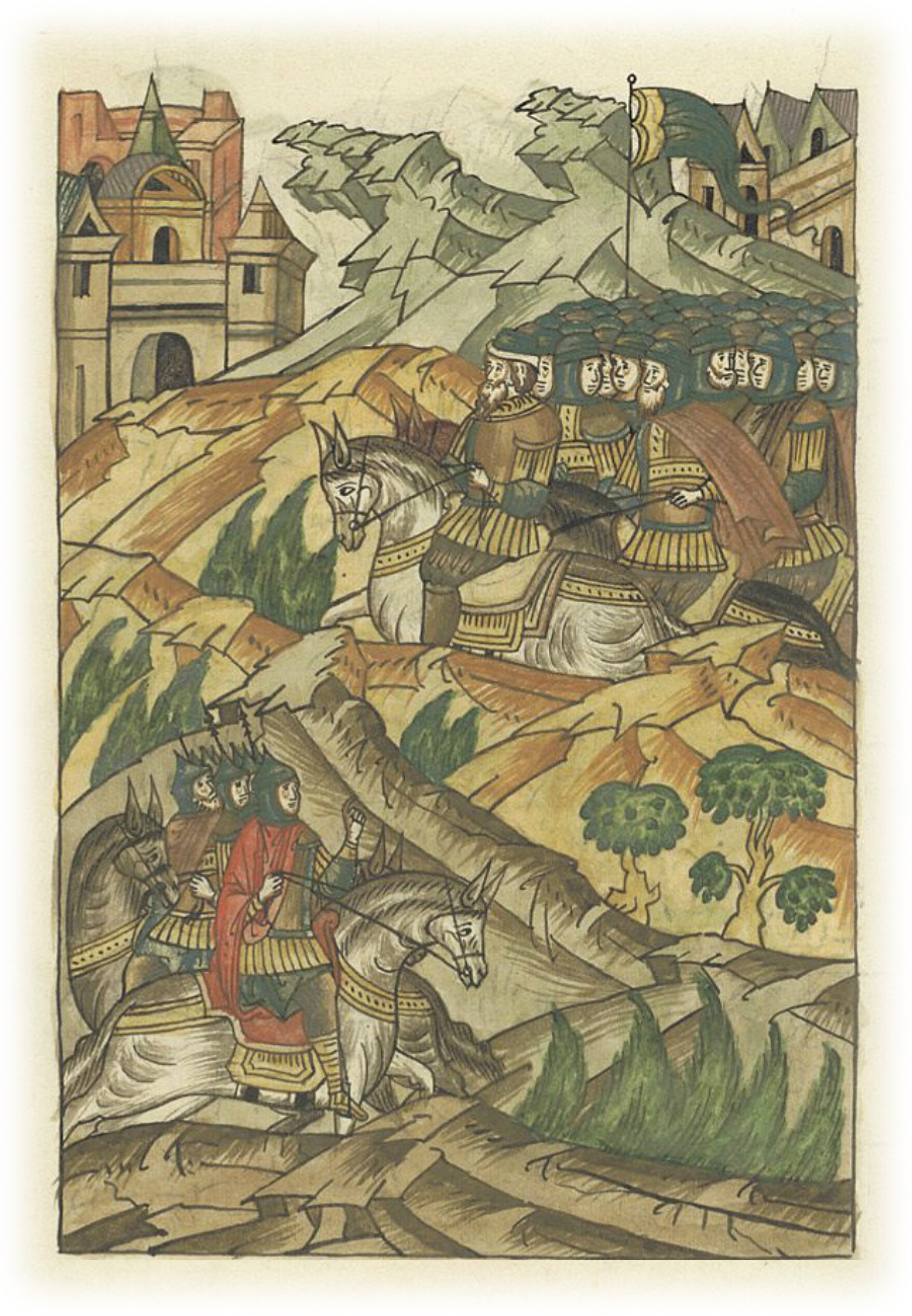 Воеводы царя Ивана Васильевича, разделившись, идут в погоню за царем Емгурчеем.