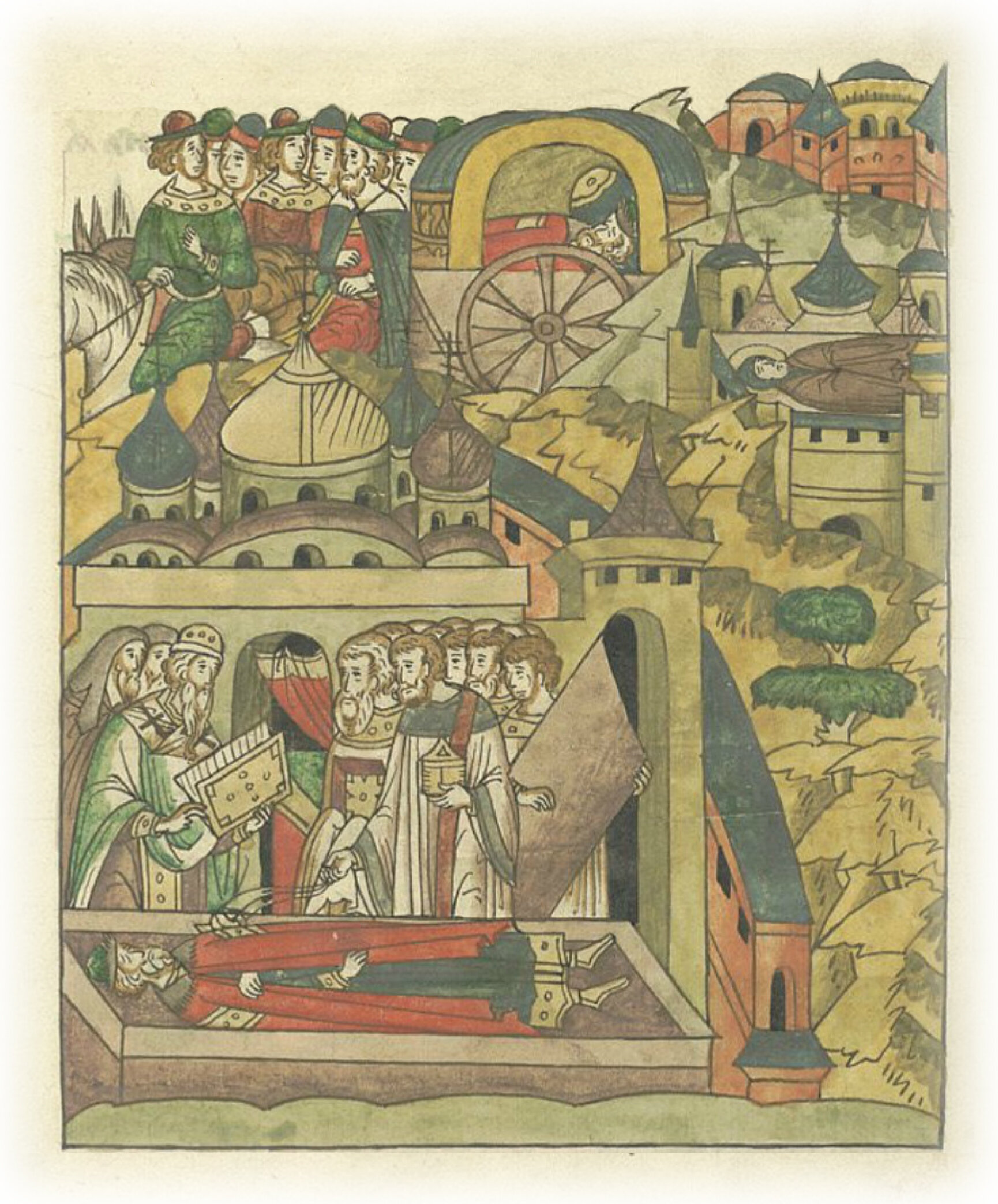 В том же году преставился князь великий Ярослав Ярославич, внук Всеволодов, правнук Юрия Долгорукого, праправнук Владимира Мономаха, препраправнук Всеволодов, (потомок) пращура Ярослава, прапращура великого Владимира, возвращаясь из Орды; держал великое княжение Владимирское после брата своего Александра Ярославича 8 лет; и отвезли его в Тверь. Епископ же Симеон Тверской с обычными надгробными песнопениями положил его в церкви святых чудотворцев Козмы и Дамьяна в Твери.