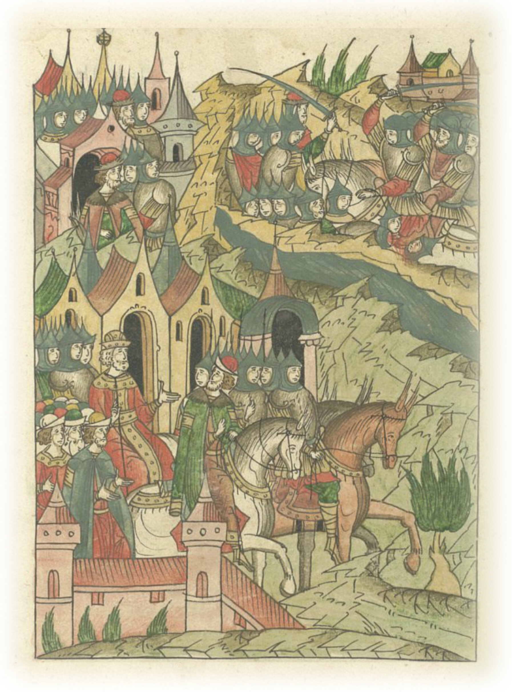 И послал князя Юрия Витовтовича с псковичами, добровольцами, к Новому городку добыть языка. Он же пошел на границу и встретил там великую рать немецкую, идущую к Изборску. И тут, у реки Мекожицы немцы убили 60 псковичей. А князь Юрий Витовтович бежал в город Изборск.