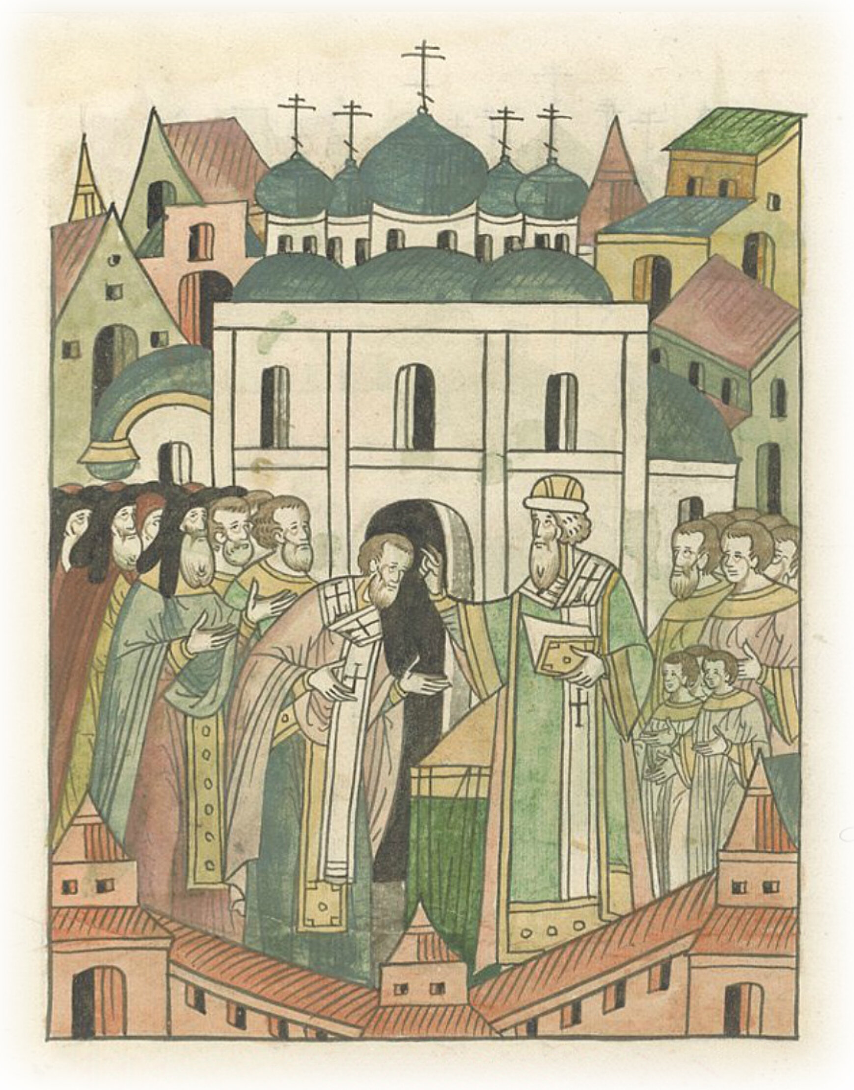 О поставлении епископа в Коломну. В ту же зиму (месяца) февраля, в неделю о блудном сыне, преосвященным Симоном, митрополитом всея Руси, был поставлен епископом в Коломну архимандрит Андрониковский Митрофан.