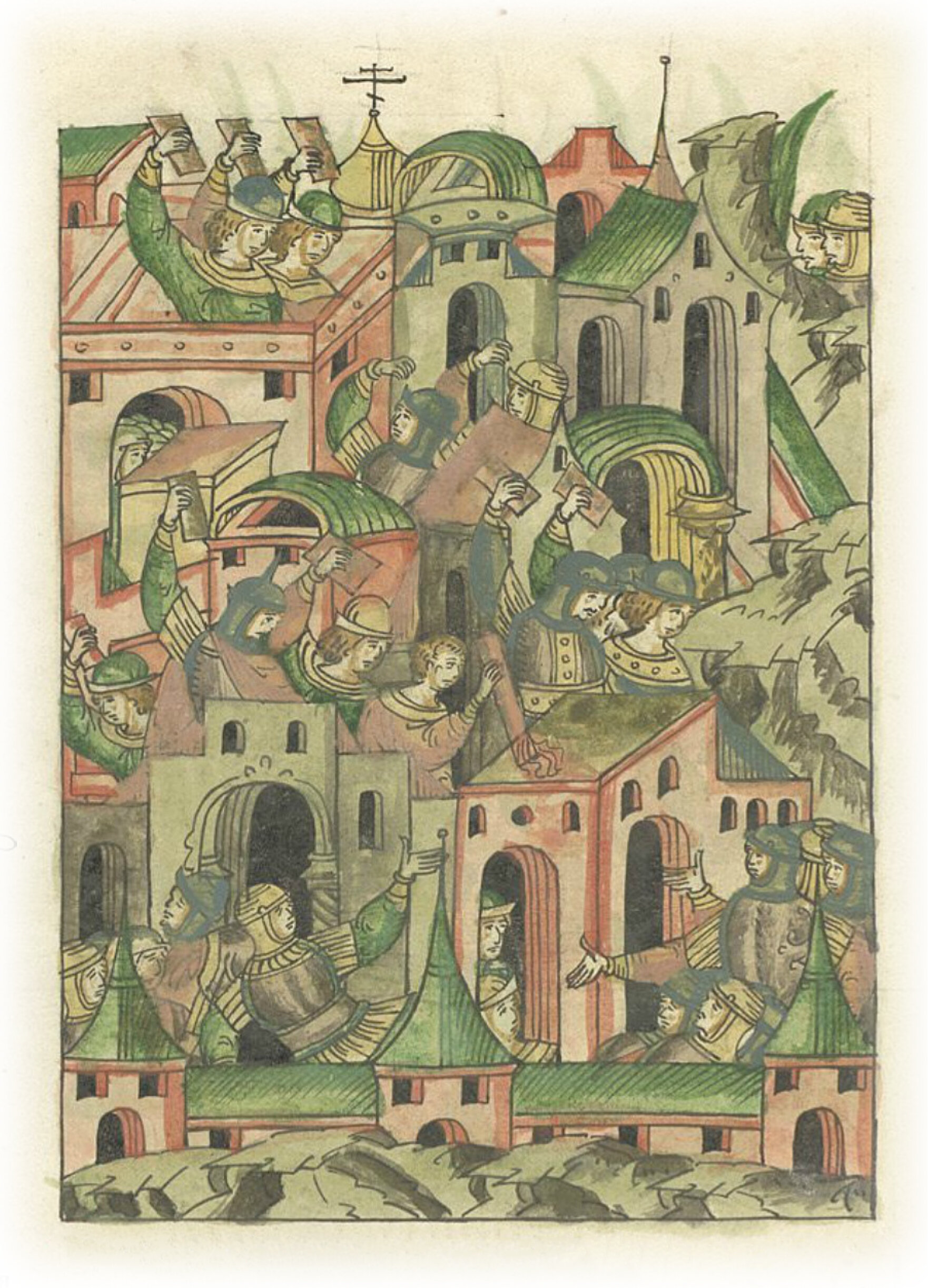 А иные люди метали на них сверху из палат черепицу и плиты, и кровли палатные деревянные зажженные с огнем метали на них, а другие иной многий вред делали. Ужаснулись паши.