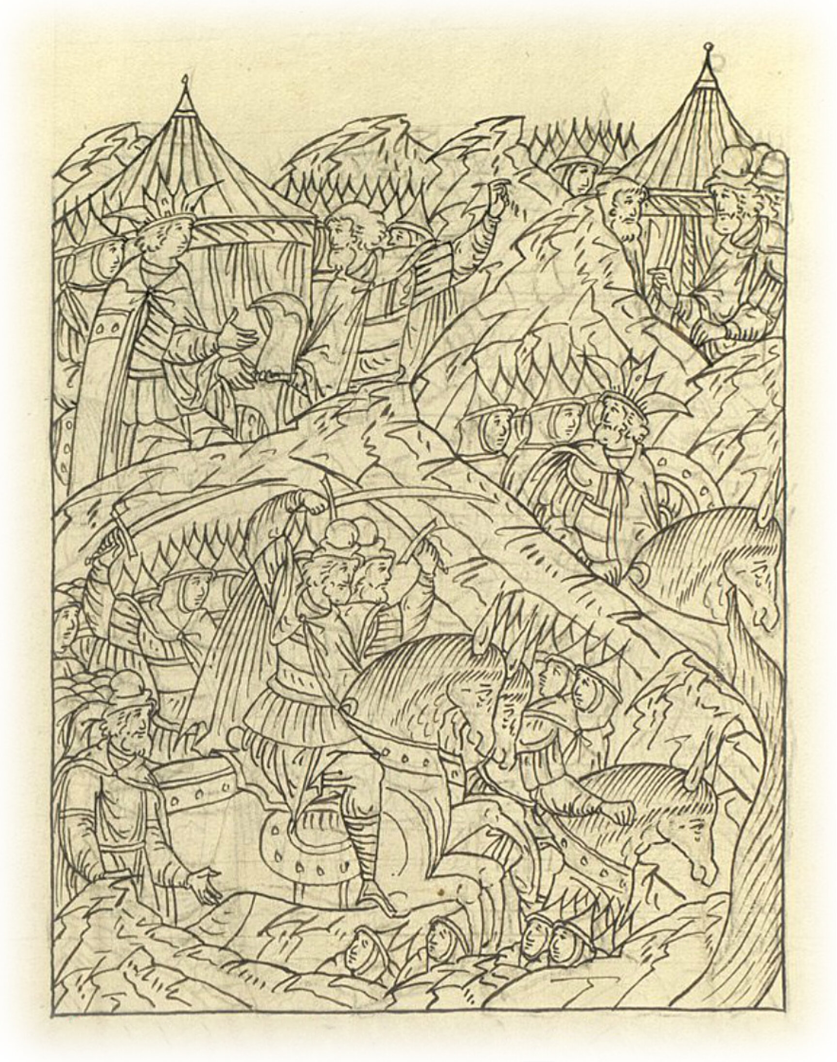 Языки говорят воеводам царя Ивана Васильевича, что магистр окопался большим рвом вокруг города Рындола, бьет из пушек и пищалей и приступает к Рындолу.