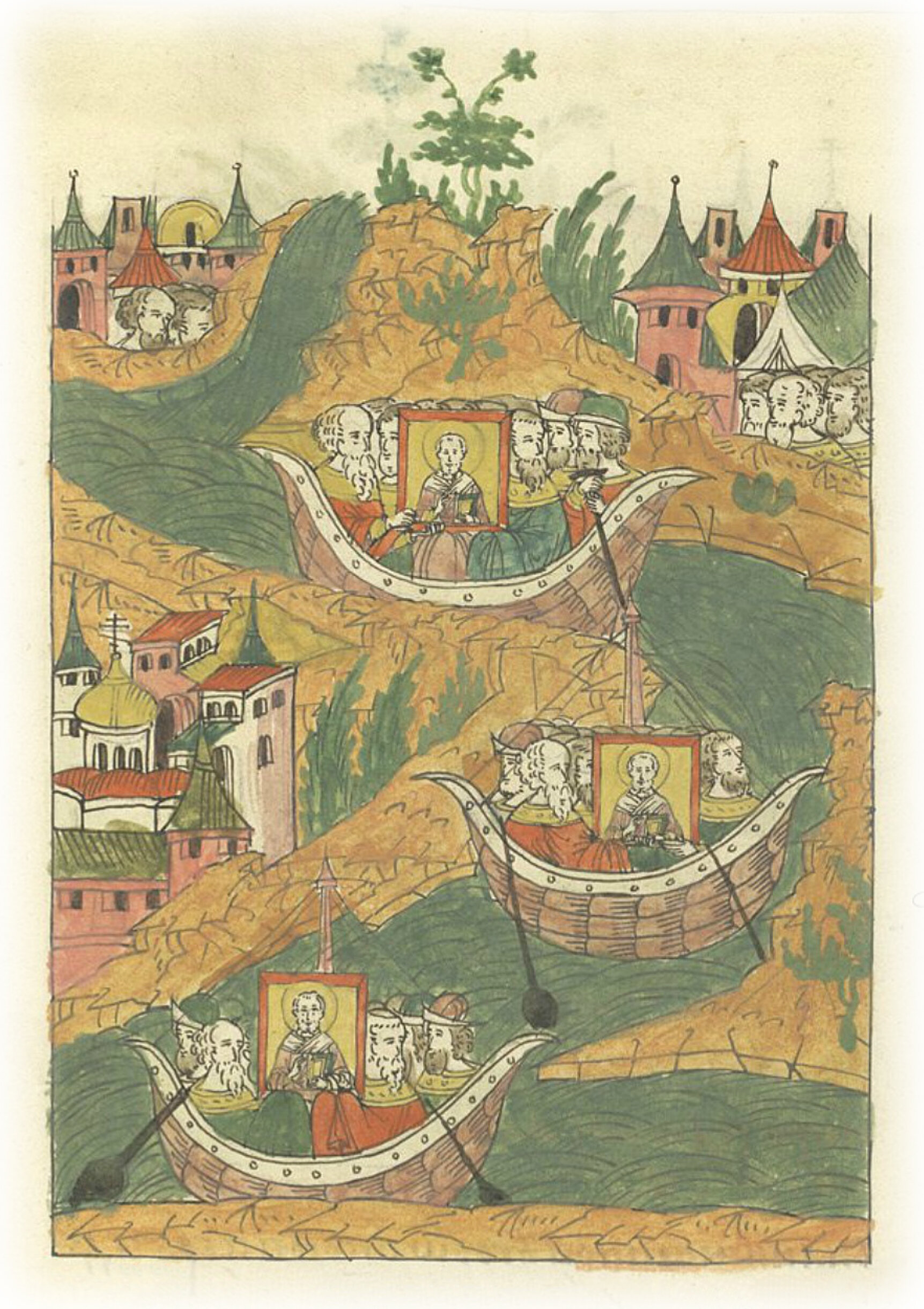 Священники с иконой чудотворца Николы Великорецкого идут в судах по Вятке, Каме и Волге на Казань и Свияжский город.
