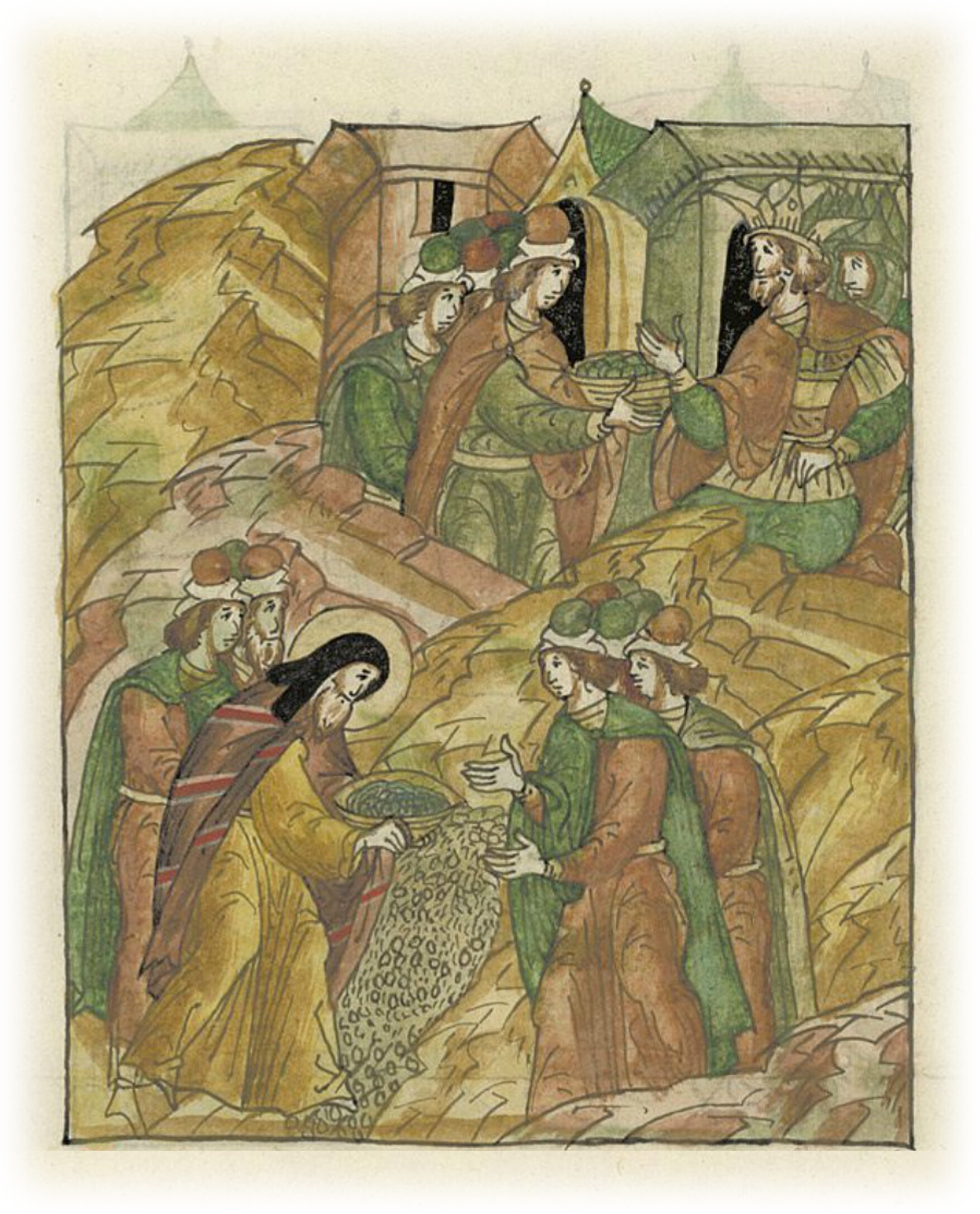и положил ледяного града в большое серебряное блюдо, королю отослал, а всем повелел брать достаточное количество. Король же, увидев это, был объят страхом