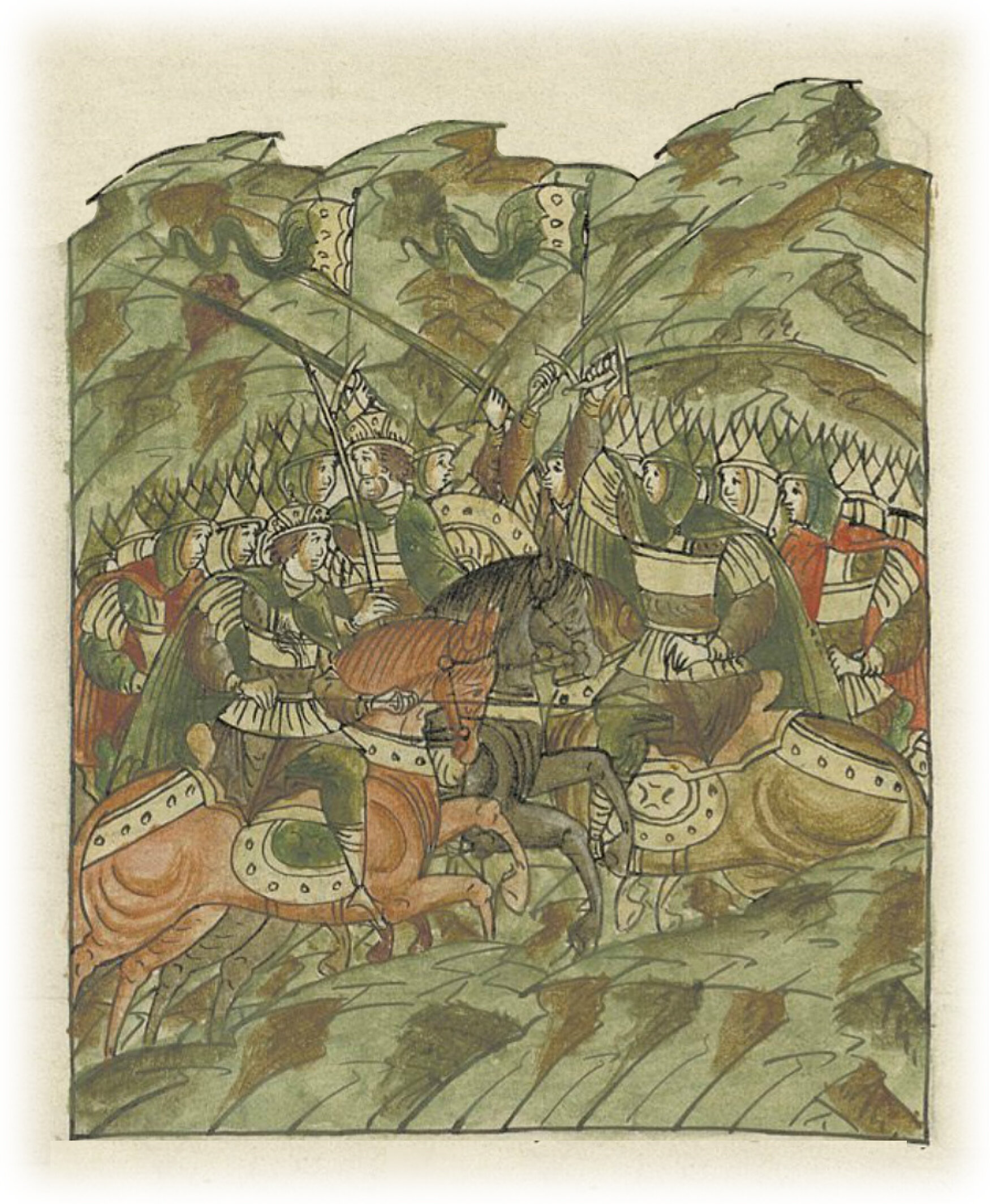 Князь же Мстислав Немой, увидев окровавленного князя Даниила Романовича (из рода) Мстиславичей, как ранили его, и как кровь его лилась, прискакал и заплакал, вскричав громким голосом; ибо был он очень крепок, и был родственником его отца, и имел большую любовь к нему, ему же и княжение свое после своей смерти обещал. Также и князь Курский Олег отважно бился с татарами.