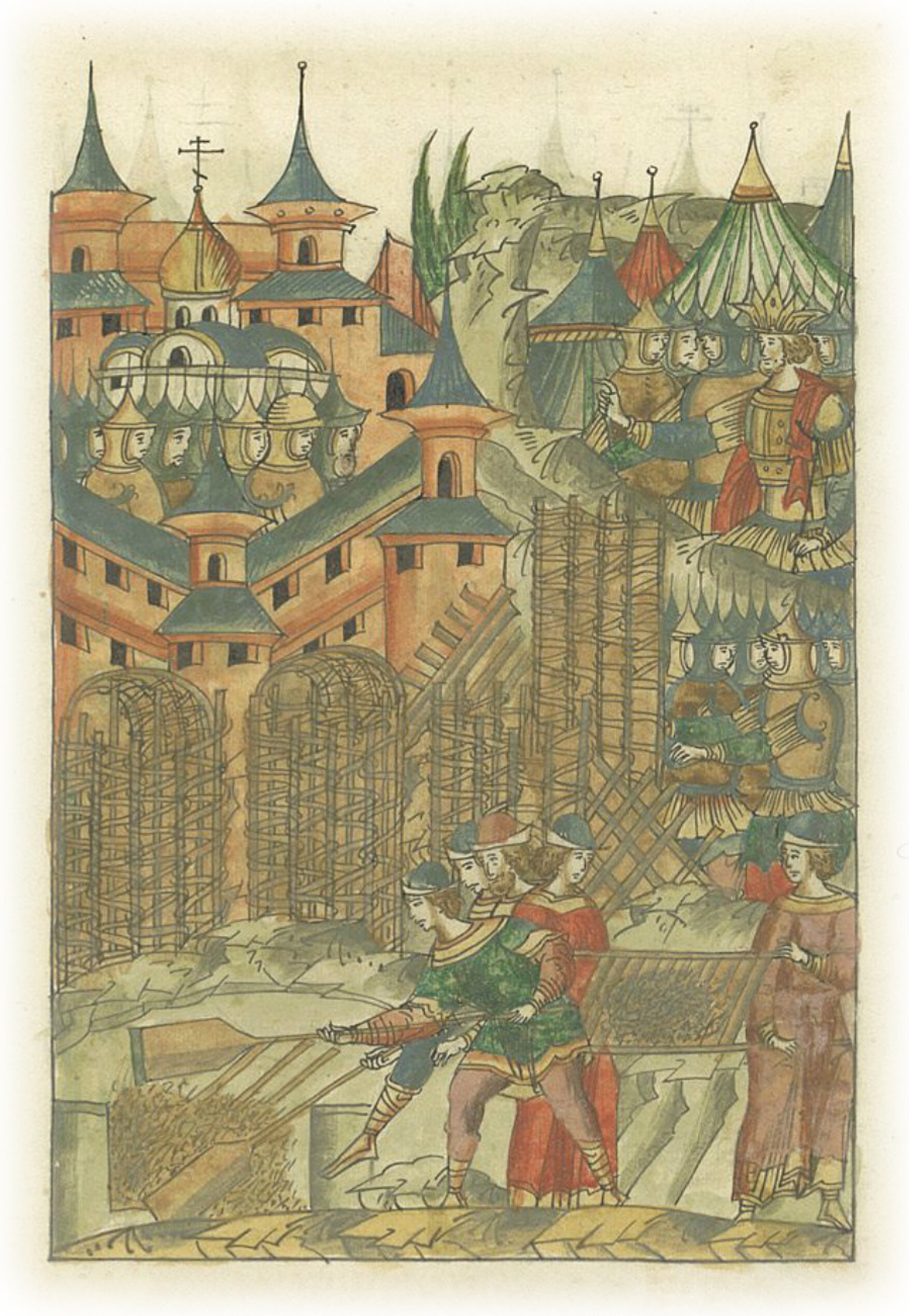 И, когда уставили туры по всему краю рва, хотели, наполнив рвы деревьями, хворостом и землею, придвинуть и прикатить туры (ближе) к городу, а также подкопав стену во многих местах, обрушить ее на землю.