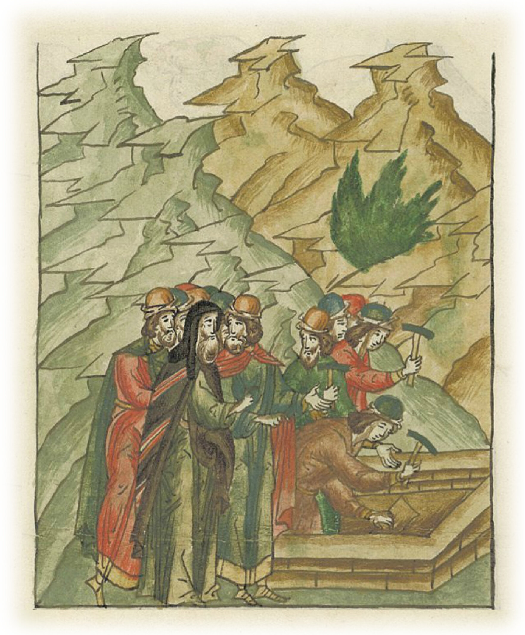 Новгородский архиепископ владыка Илья со своим братом Гавриилом закладывают каменную церковь Святого Иоанна Предтечи на Торгу.