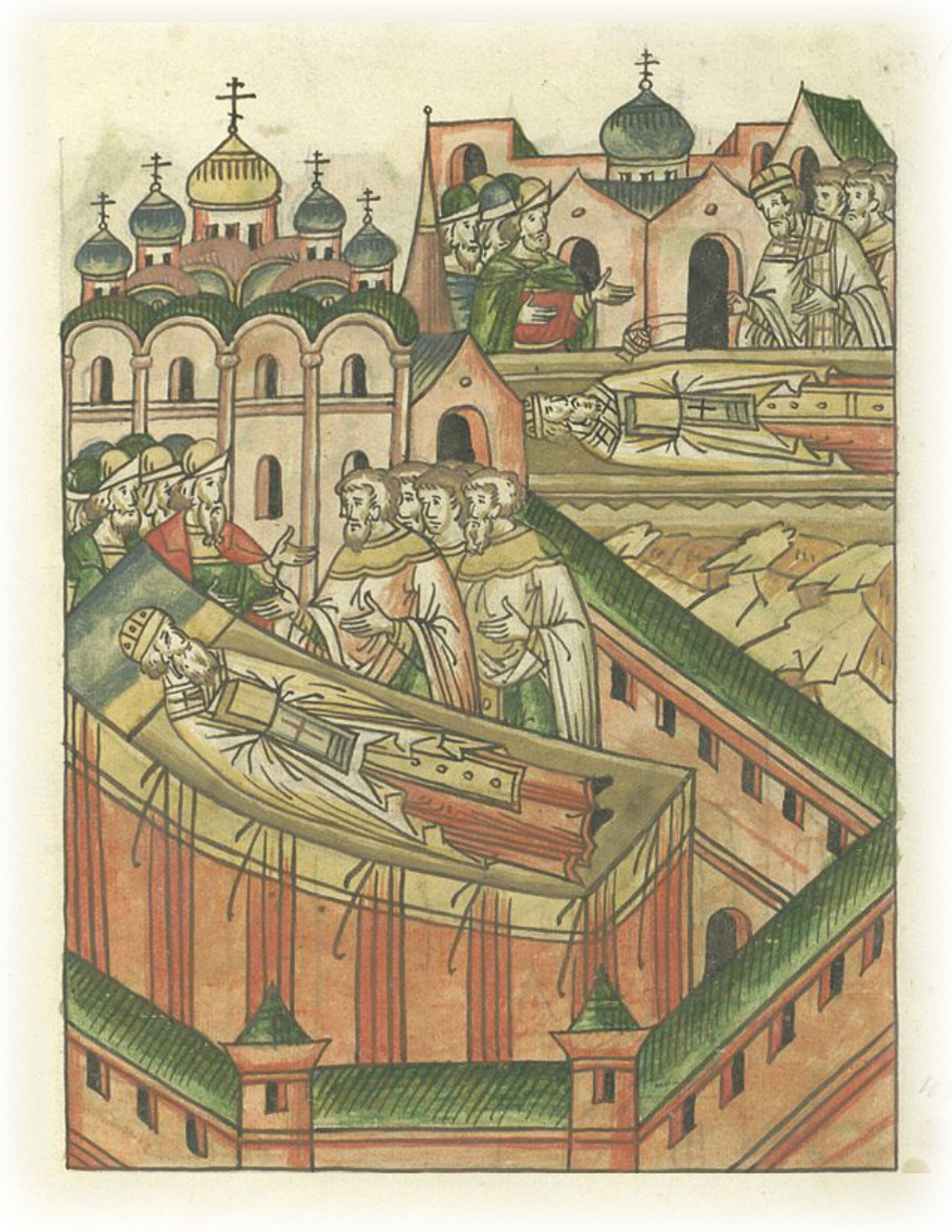 Кончина Новгородского архиепископа Моисея и его похороны у церкви архангела Михаила на Сковородке.