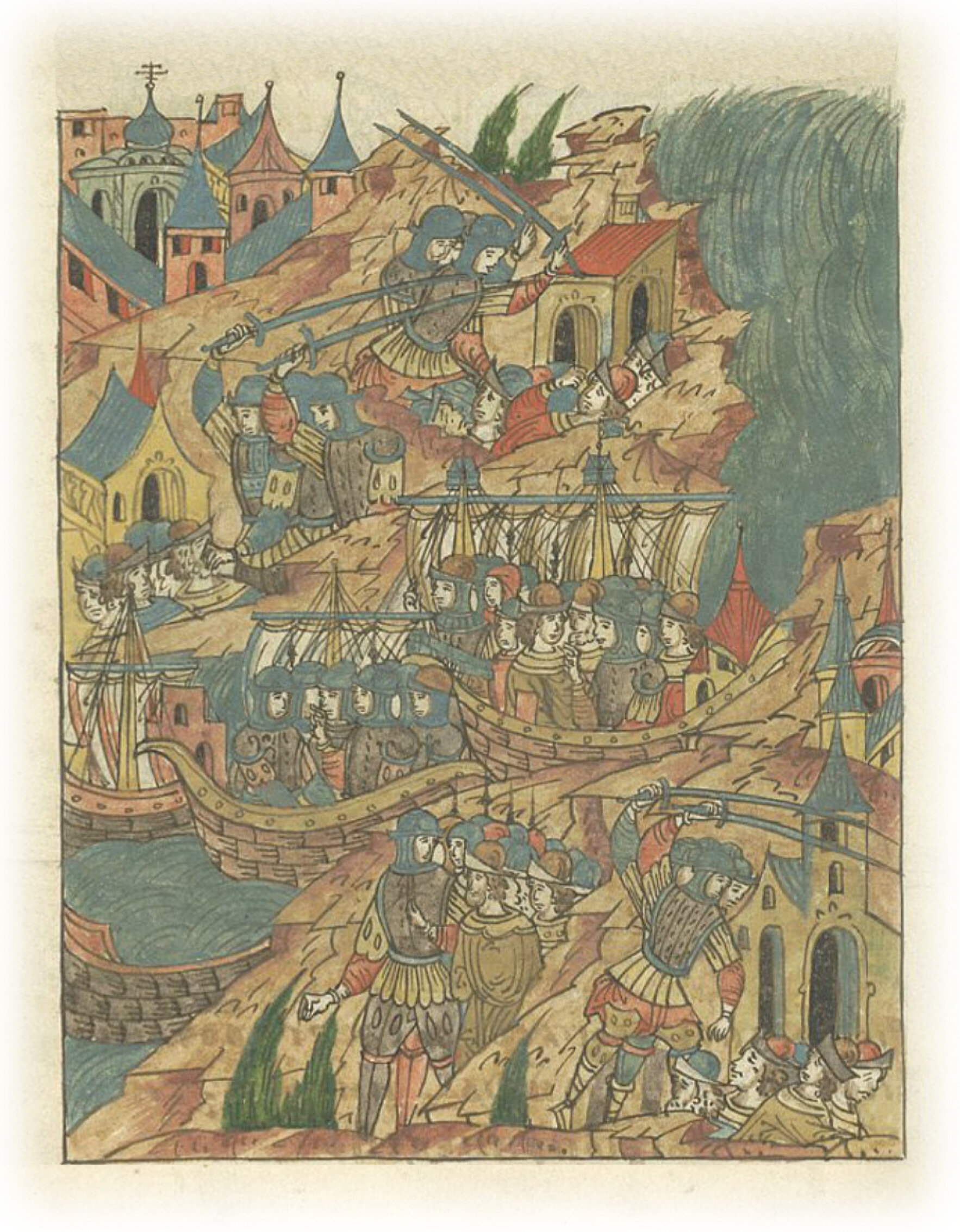 В том же году приходили разбоем немцы в Новгородские волости и вошли в Неву, взяли волости и села по обе стороны реки, за три версты от городка Орешка.