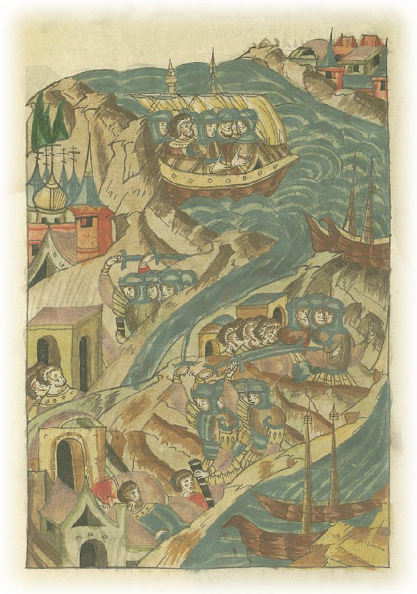 В том же году к Великому Новгороду пришли мурмане с войском в бусах* и шнеках**, завоевали в Арзуге карельские земли, а Зоволоцкой земли волости пленили и сожгли; много зла они сотворили и возвратились восвояси за море. * род мореходного судна; ** род судна.