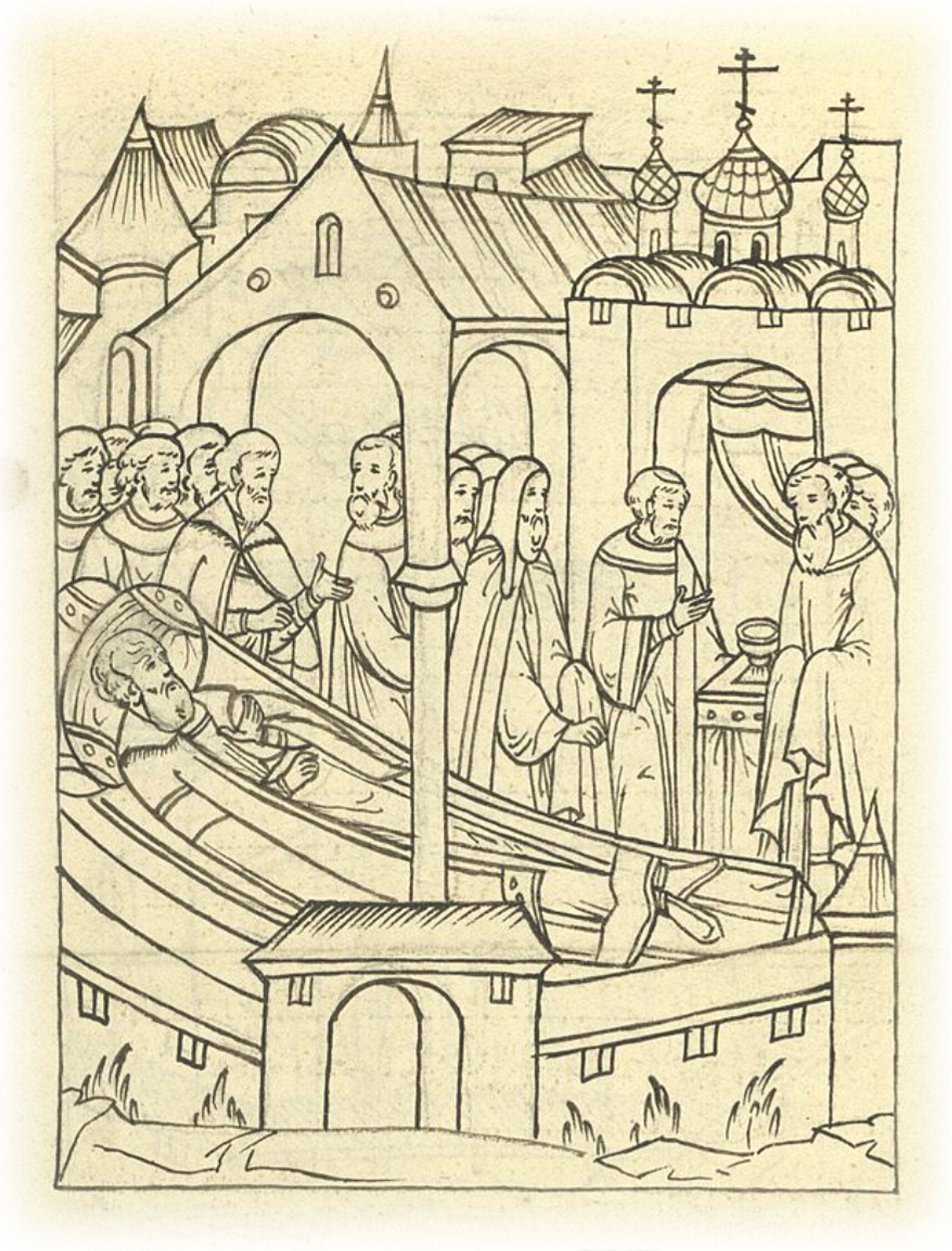 И начали божественную литургию, а князь великий лежал на одре в паперти церковной.