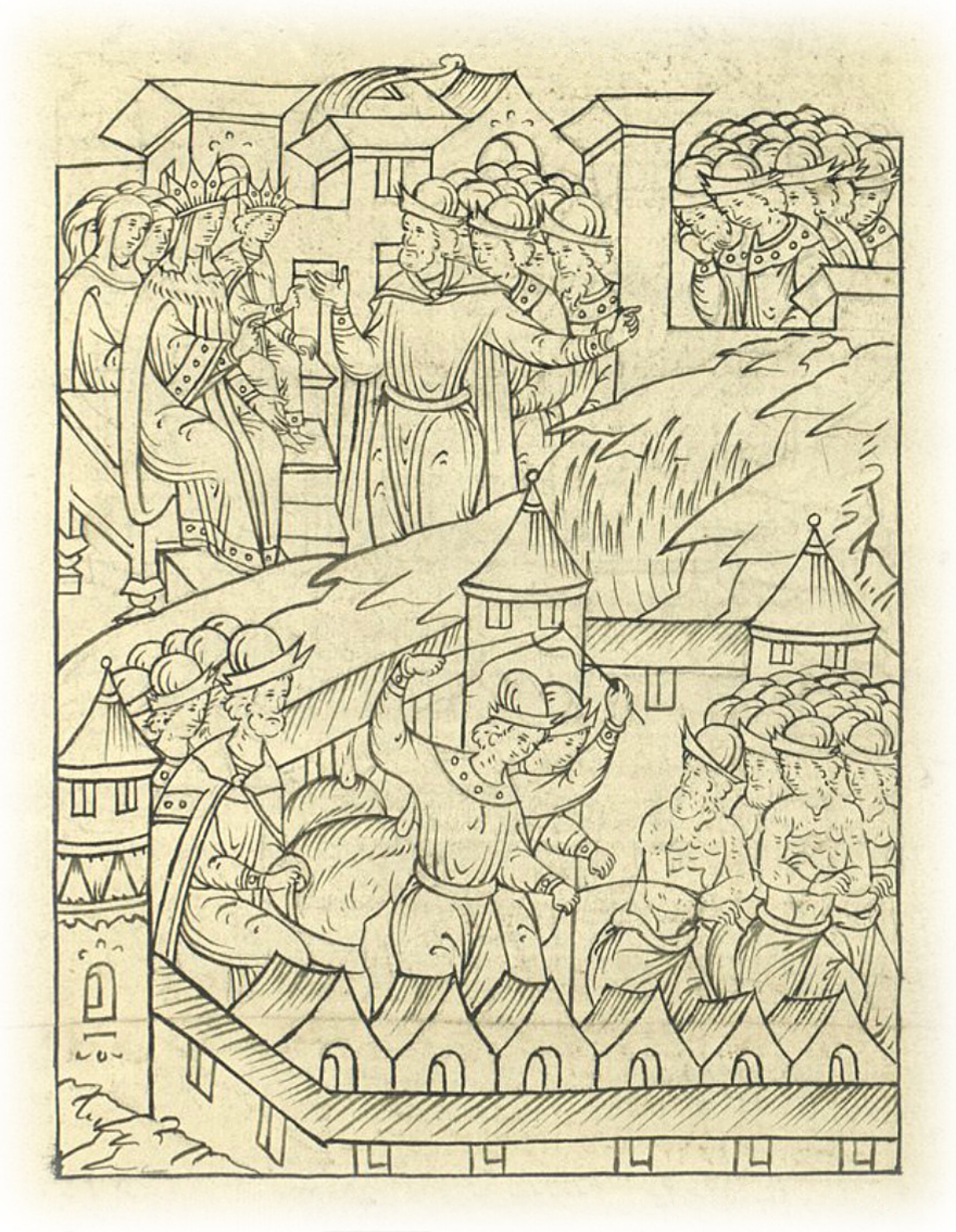 Языки говорят воеводам царя Ивана Васильевича, что магистр окопался большим рвом вокруг города Рындола, бьет из пушек и пищалей и приступает к Рындолу.