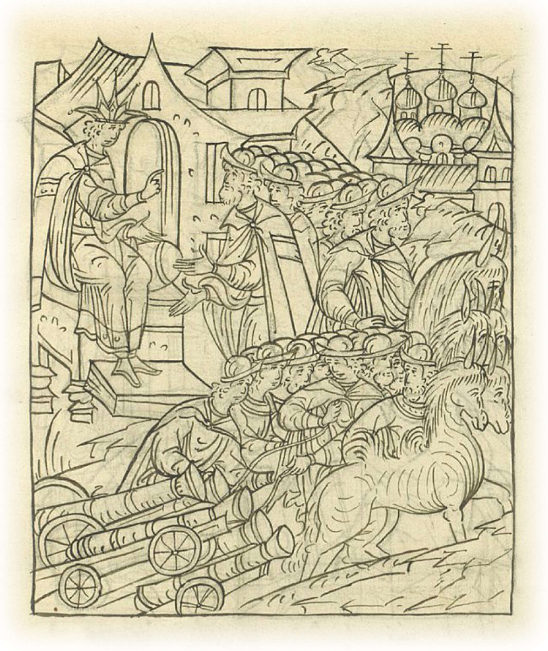 Языки говорят воеводам царя Ивана Васильевича, что магистр окопался большим рвом вокруг города Рындола, бьет из пушек и пищалей и приступает к Рындолу.